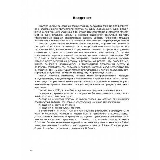 Пособия из серии "Всероссийские проверочные работы" предназначены для подготовки учащихся 4-х классов к итоговой аттестации за курс начальной школы в формате Всероссийских проверочных работ по русскому языку, математике и окружающему миру. В них содержатся варианты тренировочных заданий, позволяющие выявить уровень готовности младших школьников к выполнению ВПР и провести необходимую коррекционную работу. Структура, содержание и объём тренировочных заданий полностью соответствуют официальным демоверсиям.