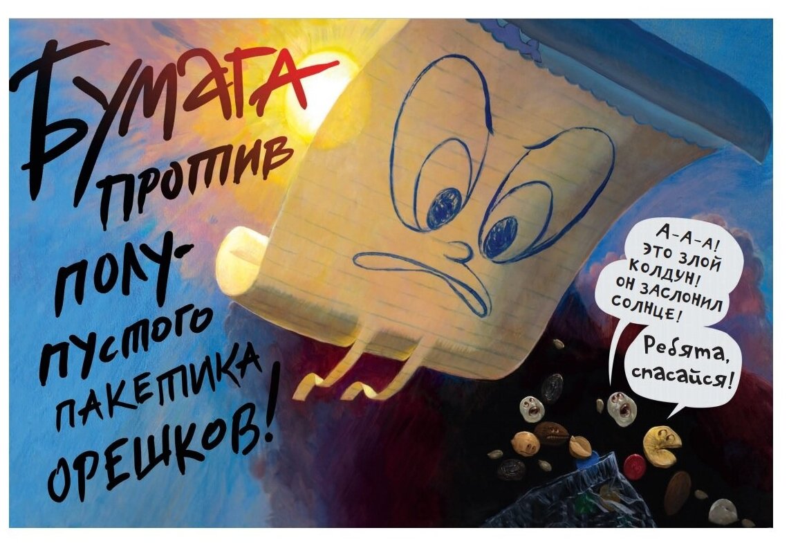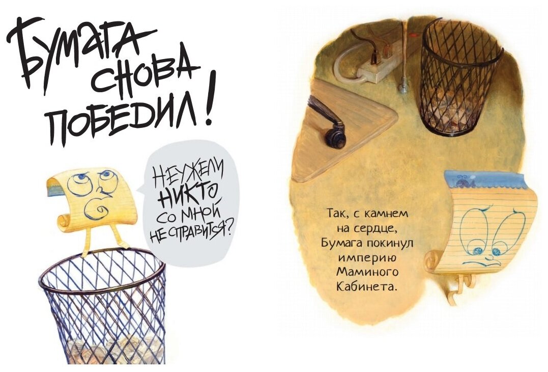Необычная детская книга, странно что мой отзыв - первый. "Камень ножницы бумага" оживляет мир привычных вещей, берет за основу игру "на пальцах" и рассказывает, как она появилась. Больше подходит мальчикам, особенно тем, кто жизнь свою не видит без драк). Развивает фантазию, (в книге очень много героев - от фруктов до прищепок) привлекает внимание к деталям. Иллюстрации порадовали, и вообще книга сделана очень качественно. Нам понравилась, взяли в подарок мальчику на День Рождения (5 лет).