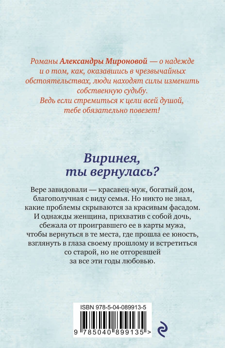 Прочитала книгу «Виринея, ты вернулась?» До этого прочитала книги Александры Мироновой « И дам вам новое сердце» и «Птице Феникс нужна неделя» Предыдущие книги мне понравились, особенно «Птице Феникс нужна неделя». Книгу «Виринея, ты вернулась?» мне посоветовали прочитать,т.к. в ней есть элементы мистики. Меня это заинтересовало. Честно говоря, первые десяток страниц было скучновато и я уже думала бросать, но потом незаметно так увлеклась,что каждый вечер думала, как выкроить время, чтобы читать дальше.А последние главы читала ночью,т.к. уже не могла оторваться! Такой широкий диапазон Александры Мироновой меня удивляет. Думаю, что на писательском небосводе появилась еще одна маленькая звездочка ! Советую прочитать эту книгу!