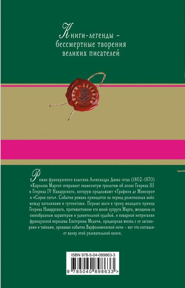 Роман французского классика Александра Дюма-отца (1802-1870) "Королева Марго" открывает знаменитую трилогию об эпохе Генриха III и Генриха IV Наваррского, которую продолжают "Графиня де Монсоро" и "Сорок пять". События романа приходятся на период религиозных войн между католиками и гугенотами. Первые шаги к трону молодого принца Генриха Наваррского, противостояние его юной супруги Марго, женщины со своеобразным характером и удивительной судьбой и коварной интриганки французской королевы Екатерины Медичи, придворная жизнь с ее заговорами и тайнами, кровавые события Варфоломеевской ночи - вот что составляет канву этой увлекательной книги.