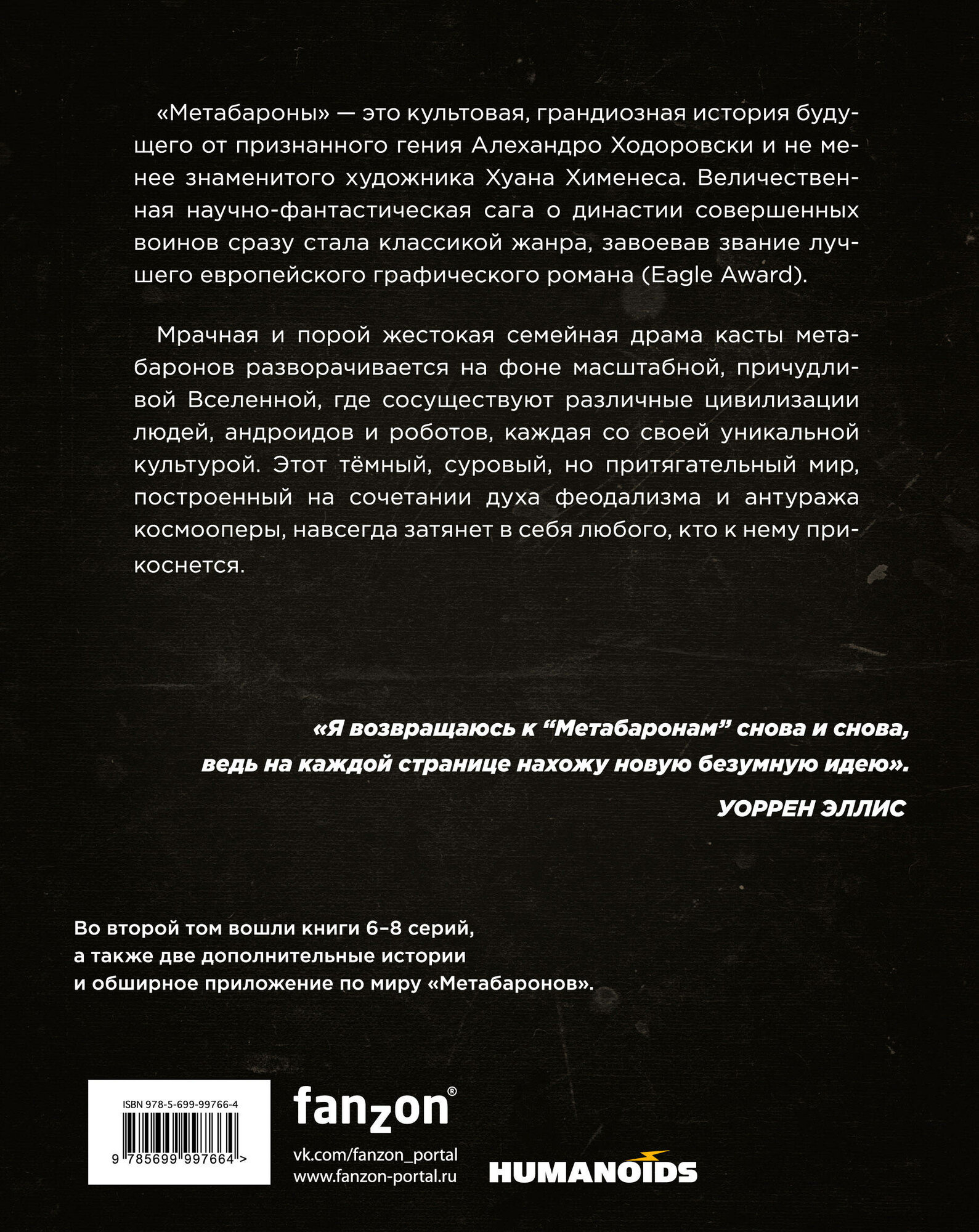 "Метабароны" - это культовая, грандиозная история будущего от признанного гения Алехандро Ходоровски и не менее знаменитого художника Хуана Хименеса. Величественная научно-фантастическая сага о династии совершенных воинов сразу стала классикой жанра, завоевав звание лучшего европейского графического романа (Eagle Award).