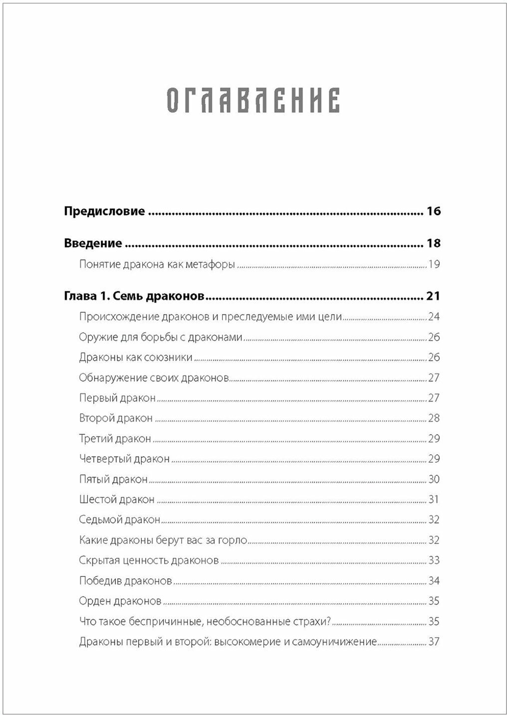 Что же такое драконы? Это те самые негативные приобретенные в процессе социализации качества, которые мешают жить полноценной жизнью. Не стоит путать позитивные черты с драконами. Например упрямство это не упорство. Упрямство это боязнь всего нового. Это выжидание жизни. Это "нет" на автомате, чтобы выгадать себе время на подумать. Упорство же это систематическое повторение попытки после ошибки или отказа. Высокомерие это не высокая самооценка. Высокомерие - это неуверенность в себе. Это закрытость и отстраненность. Это призрение к людям. Это непринятие себя и других. Это желание поправлять людей. Это ощущение что ты не хорош такой, какой ты есть. Это втягивание живота и постоянное поправление одежды на людях. Это постоянное желание одобрения со стороны. Это страх публичных выступление и боязнь упасть в грязь лицом. Человек с высокой самооценкой ничего этого не боится, он просто действует. Вы и сами сможете прочувствовать разницу прочитав эту книгу. Нужно несколько лет, а иногда и помощь специалиста, чтобы справиться с драконами и поменять психику. У каждого есть шанс изменится, у 99% людей есть шанс жить счастливо и свободно. Но проще сказать, что люди не меняются. Потому что пользуются этим шансом 1% людей. Только 1% людей избавляются от своих драконов полностью. Из книги можно узнать кто такие учителя и мудрецы. Чем отличаются мудрые известные на весь мир люди (Ганди, Мать Тереза, Гурджиев, стоик Сенека), оставившие свой след в сердцах и в истории человечества от несчастных, льющих критику и желчь, умирающих в одиночестве и страданиях, так и не успевших пожить. Последние - капризные младенцы и вспыльчивые подростки во взрослых телах.
