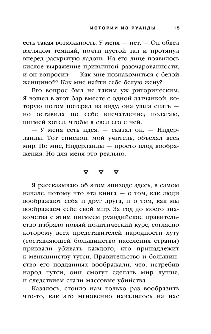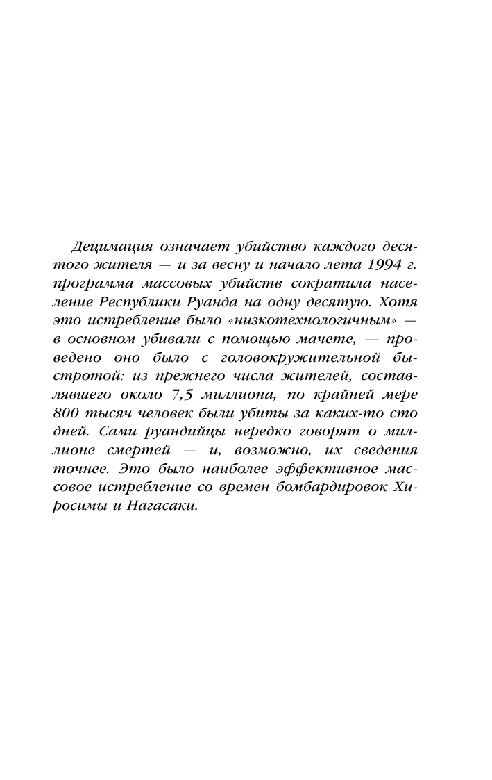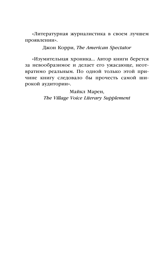 Автор идеально выбрал тональность и стилистику повествования. Текст не зациклен на живописании кошмара, а льется, как речь человека, пережившего огромный психологический шок и находящегося в состоянии полной анестезии эмоций… только факты, только оценка увиденного и услышанного от выживших жертв и тех, кто убивал, и до сих пор силится понять, почему он это делал… даже все размышления, логические выкладки изложены с бесстрастием бесконечно потрясенного человека... Как ни парадоксально, книга не «тяжелая» в обычном читательском представлении. В ней нет избытка крови и жестокости, читается она легко, потому что, по сути, является чем-то вроде модных нынче «исторических психологических триллеров», этакой попытки дедуктивного осмысления корней ситуации, исходя из ее финала. Горячо советую.