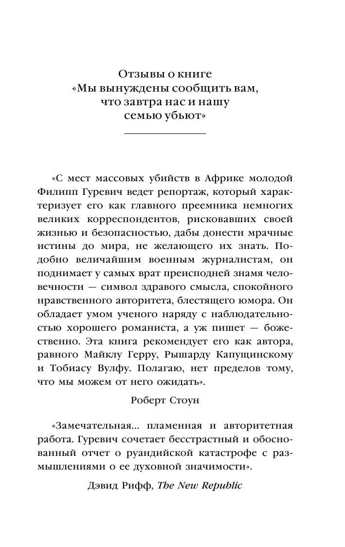 Сильная и мощная книга. Название книги - это слова из письма представителей тутси священнику хуту, они просили его о помощи. Но он присоединился к палачам. Соседи убивали соседей, врачи пациентов и так далее. Мачете - страшное оружие, пострашнее атомных бомб. сложно даже представить, как человек просто идет и рубит других - это физически очень непросто.. Вообще, конечно, в истории нашей страны хватает трагедий и зверств. Но эта история цепляет тем, что всего этого могло бы и не случиться, если бы не прогрессивные западные страны, которые буквально стравили народности между собой, стравили и ушли. Во многом книга Гуревича именно об этом, о том, что причины этого геноцида не так просты, как могло показаться на первый взгляд. Ответственность за трагедию лежит в том числе на США, Франции, Бельгии. Они допустили повторение трагедии всего через несколько десятилетий после холокоста. Советую читать тем, кто любит качественный нон-фикшн (язык на высоте), и не боится сложных тем.