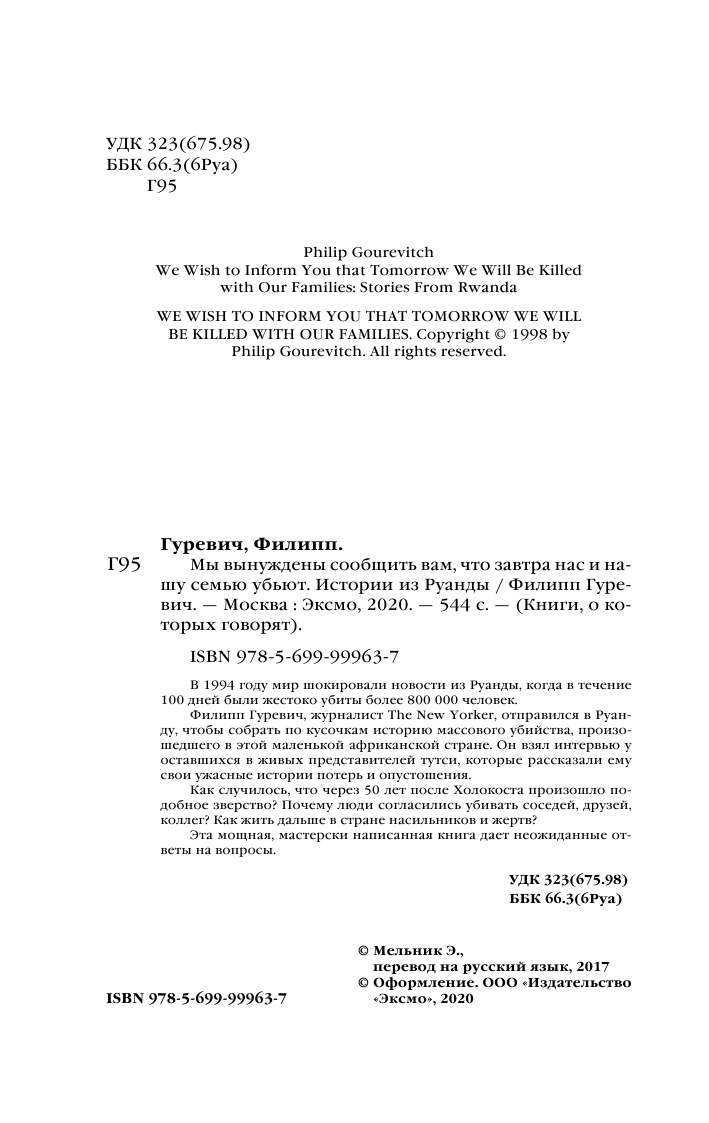 Мы вынуждены сообщить вам что завтра нас и нашу семью убьют. Истории из Руанды (Гуревич Филипп, Мельник Элеонора Игоревна (переводчик)); Эксмо, 2018