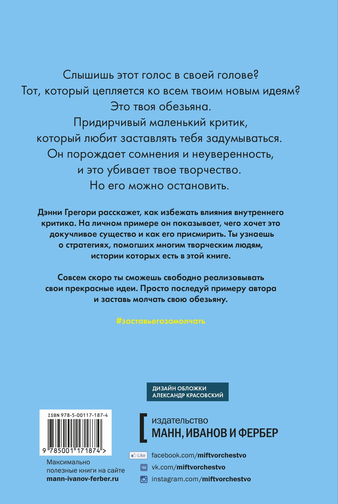 Отличнейшая книга! Читается на одном дыхании! Теперь я стал осознавать голос своей "обезьяны" и стал видеть описанные в книге механизмы ее воздействия на меня. Благодаря книге увидел подавление творчества в себе и пути работы с приручением обезьяны. Книга выполнена в творческом и легком стиле с множеством картинок и фото! Настоятельно рекомендую тем, кто интересуется вопросом работы с внутренним критиком. Но не ждите, что само прочтение книги чем то поможет, впереди много работы!