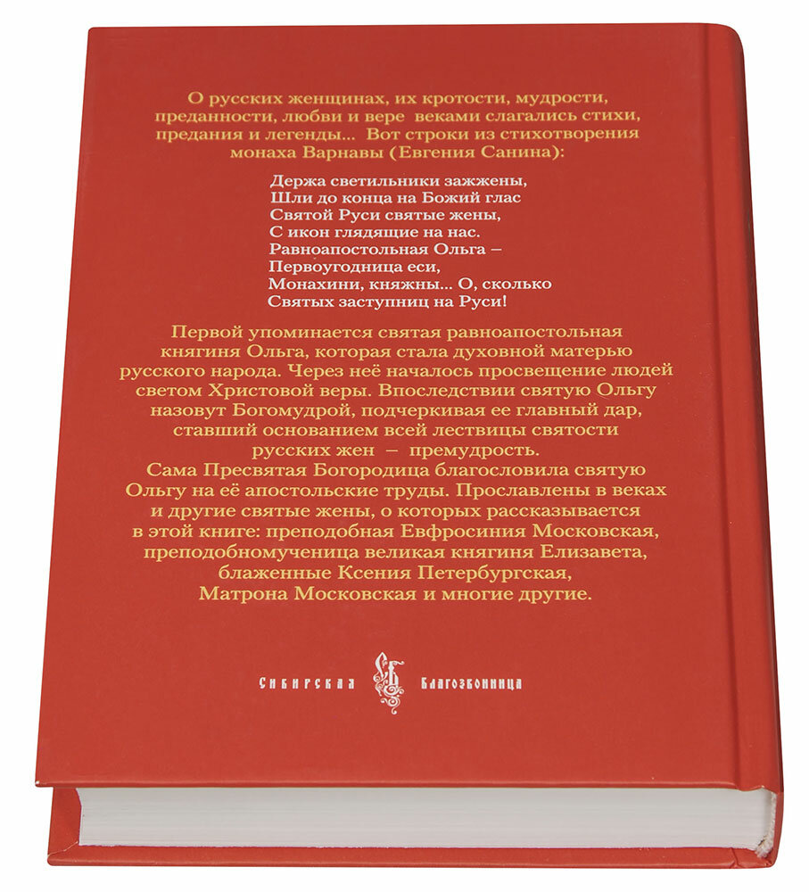 О русских женщинах, их кротости, мудрости, преданности, любви и вере веками слагались стихи, предания и легенды… Первой упоминается святая равноапостольная княгиня Ольга, которая стала духовной матерью русского народа. Через неё началось просвещение людей светом Христовой веры. Впоследствии святую Ольгу назовут Богомудрой, подчеркивая ее главный дар, ставший основанием всей лествицы святости русских жен - премудрость. Прославлены в веках и другие святые жены, о которых рассказывается в этой книге: преподобная Евфросиния Московская, преподобномученица великая княгиня Елизавета, блаженные Ксения Петербургская, Матрона Московская и многие подвижницы благочестия.