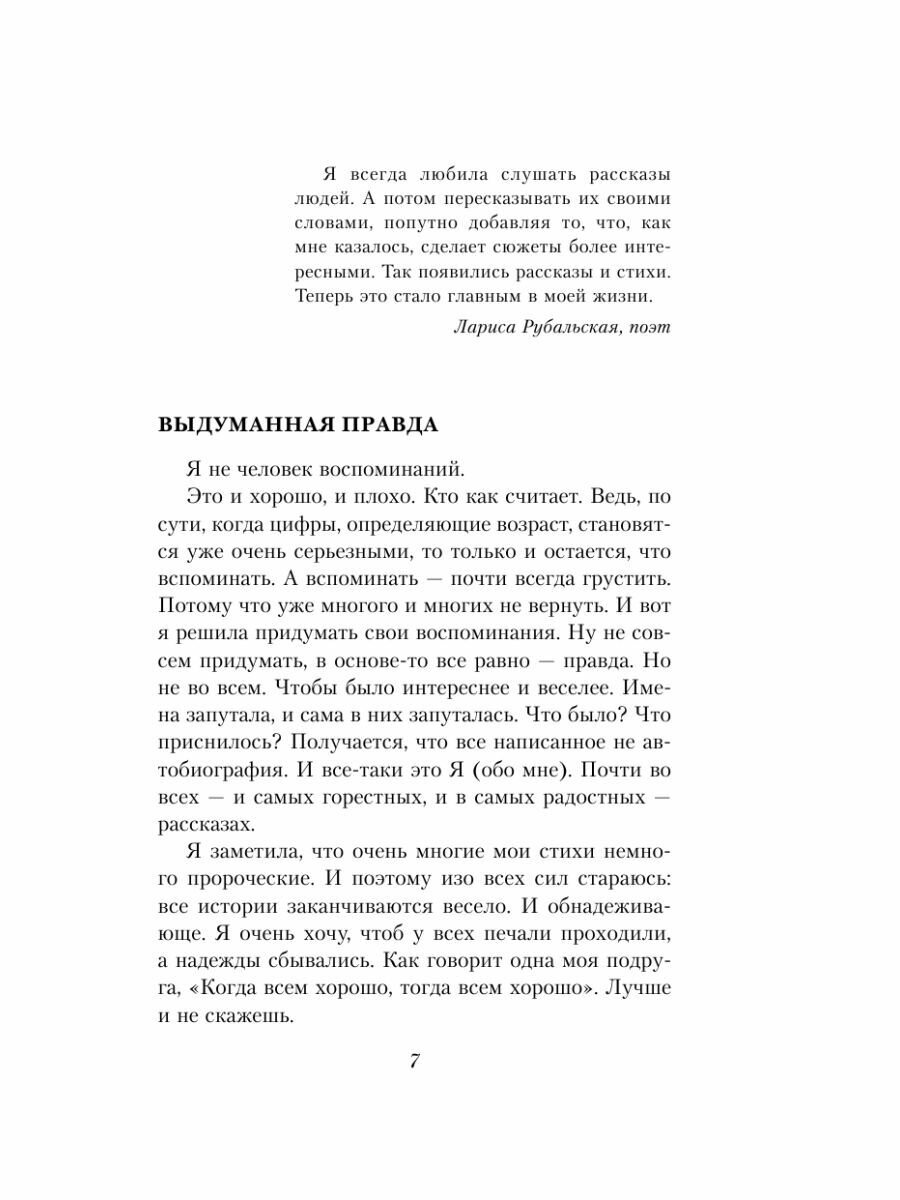 В книге собраны самые лучшие и совсем новые романсы Ларисы Рубальской, а также рассказы, в которых наиболее полно отражены биографические мотивы. Жанр этих историй сам автор называет "выдуманной правдой". С присущей Ларисе Рубальской теплотой и душевностью она вновь и вновь делится с читателями надеждами и любовью.