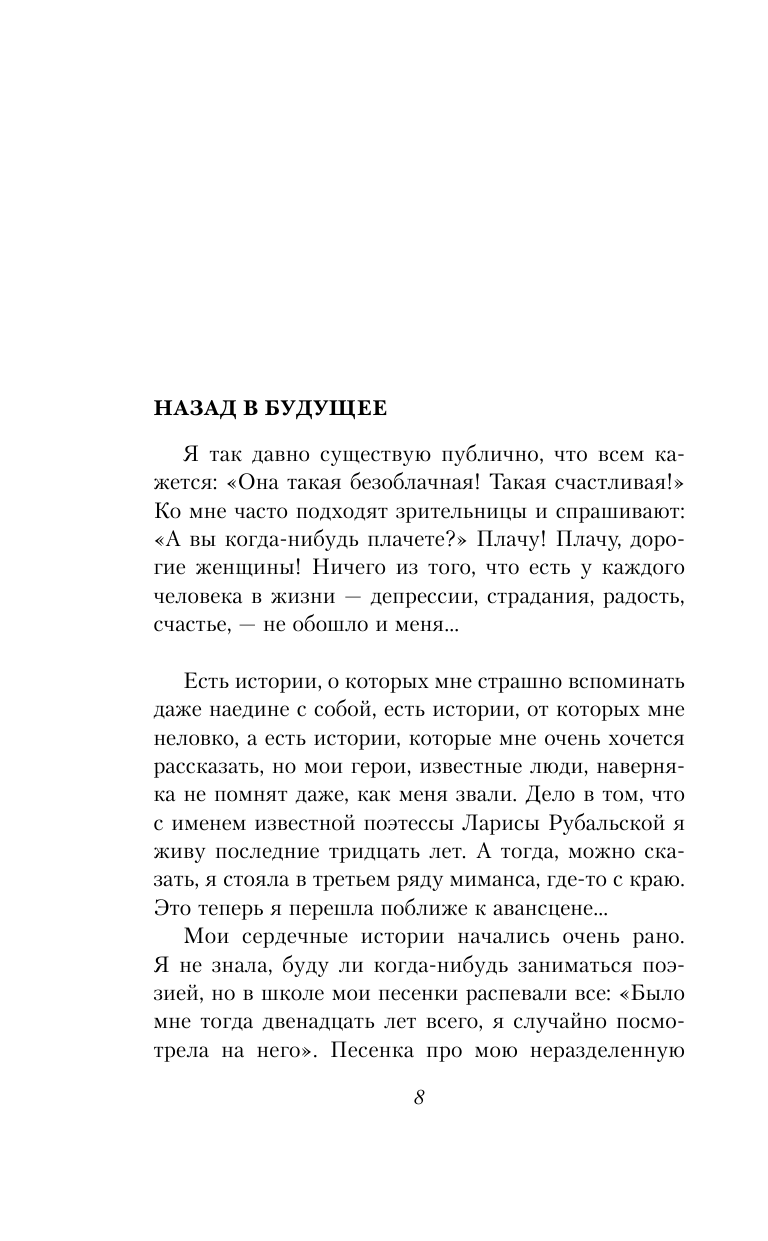 Люблю Ларису Рубальскую за её душевность и искренность. Обожаю её стихи! А вот книга совершенно не понравилась. Разочаровала. Какое-то непоследовательное повествование... и есть вещи, про которые не следует писать поэту-песеннику, чтобы не спугнуть чистоту поэзии. Это на мой взгляд.