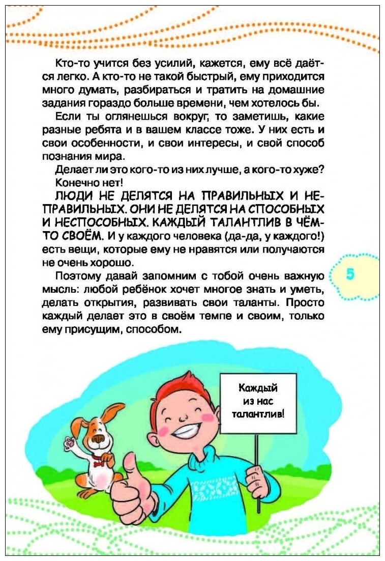 Очень полезная и удачная книга. Она предназначена для детей, но и для взрослых не будет лишней. Мне она понравилась не только потому, что большинство мыслей, изложенных в ней, совпадает с тем, что я говорю своему ребёнку по поводу учёбы в частности и школы вообще, а значит она послужит подтверждением моих слов, которое ребёнок получает из "стороннего" источника. В книге нет "воды", пространных рассуждений о пользе школы, она очень конкретная, освещает основные школьные проблемы, предлагает ребёнку как с ними справится. Сын прочёл её быстро, она ему понравилась, он сам считает её полезной книгой, которую стоит применять на практике. Но для более полного усвоения стоит прочесть её несколько раз и периодически возвращаться к ней, чтобы найти выход из конкретной ситуации - будь то сложность с заучиванием иностранных слов или обида на одноклассников.