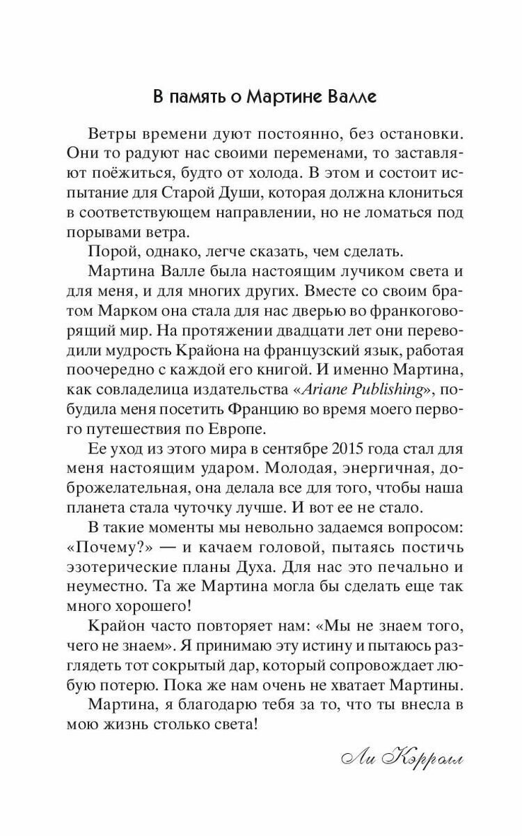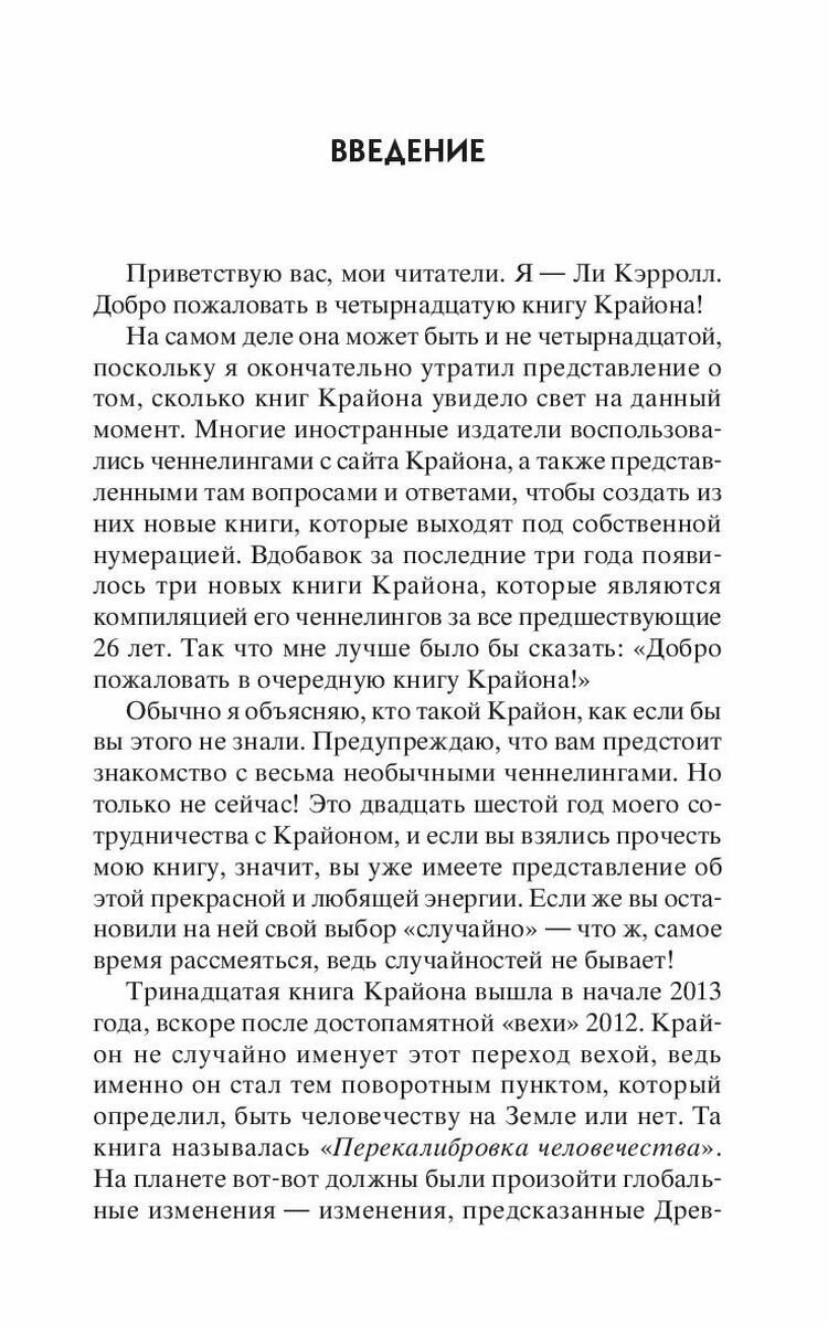 Замечательная книга, в ней очень многое объясняется о том как настроить своё мировосприятие и подготовить себя к новой жизни в новой вселенской энергии. Когда держишь эту книгу в руках сразу настраиваешься на другой, очень светлый и позитивный лад, сразу забываются все негативные моменты которые случились в жизни до этого! Ли Кэрролл очень здорово передаёт послания Крайона, пишет как от его имени так и от своего, чувствуется свет в каждом слове. Читая эту книгу ещё больше хочется нести в мир свет, позитив и конструктив!!! Книга учит адекватно и правильно реагировать на то, что в жизни не нравится и тому, каким должен быть светлый и новый человек!!!! Спасибо за внимание!!