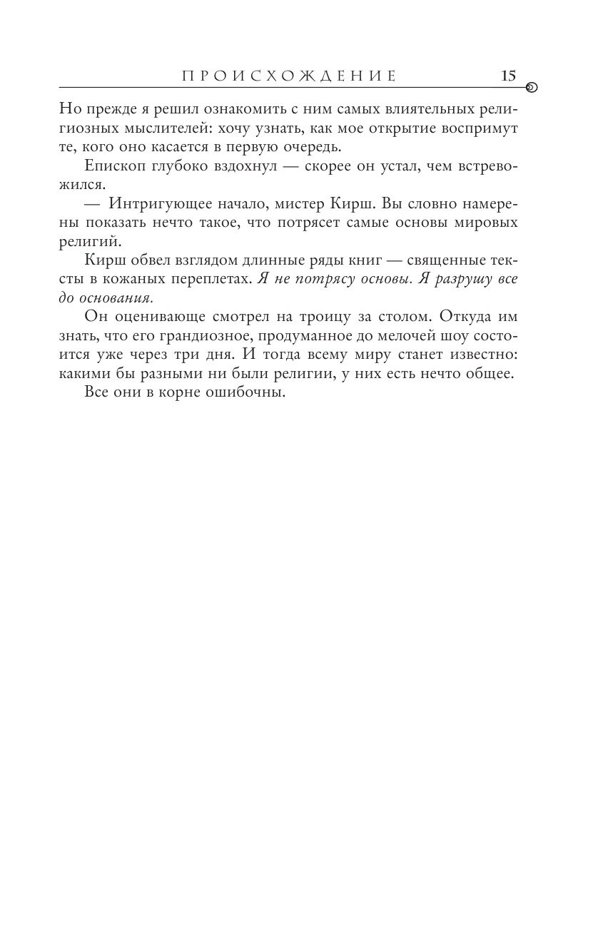 Теперь их путь лежит в Барселону, где Кирш оставил для своего учителя закодированный ключ к тайне, способной потрясти сами основы представлений человечества о себе. Тайне, которая была веками похоронена во тьме забвения. Тайне, которой, возможно, лучше бы никогда не увидеть света, - по крайней мере, так считают те, кто преследует Лэнгдона и Видаль и готов на все, чтобы помешать им раскрыть истину.
