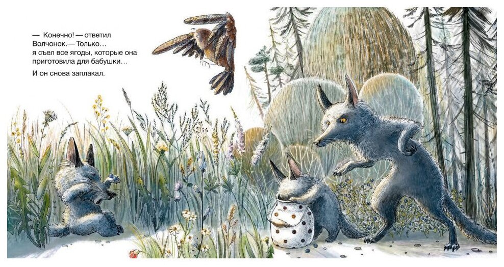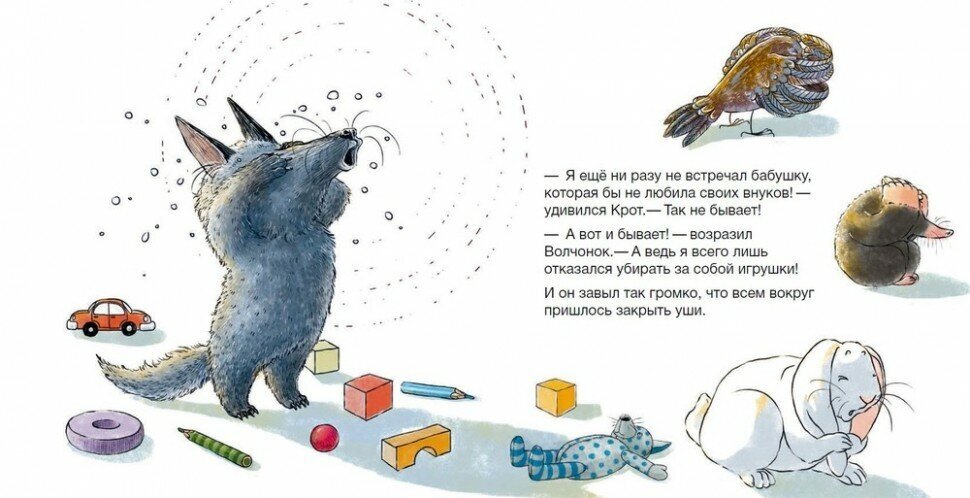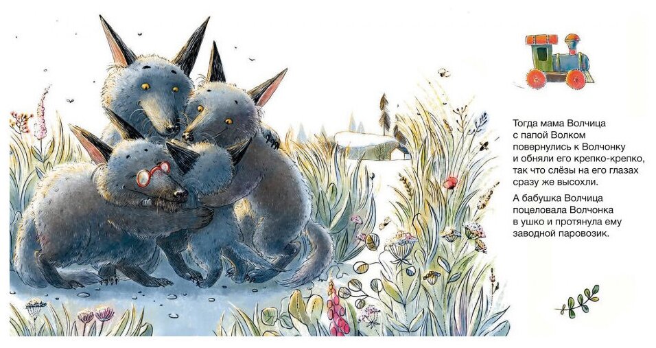 Интересно, что волки выступают в качестве антигероев практически во всех сказках, а в этой книжке показано что и у них есть чувства, переживания и, главное, семья. Шикарные карандашные иллюстрации, детальная прорисовка всех персонажей заставляют подолгу рассматривать книжку и прочувствовать эмоции. Медведь правда, выглядит немного пугающе, но моей дочери книга очень нравится, особенно момент объятий самом в конце.