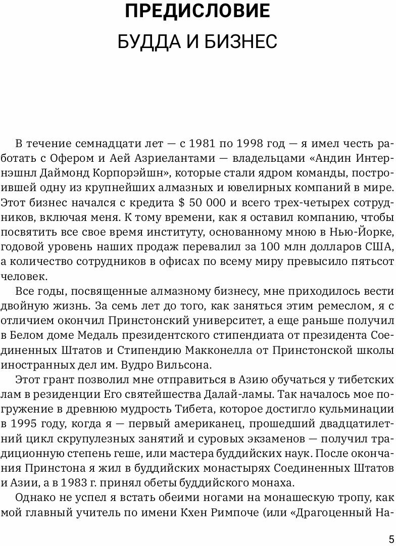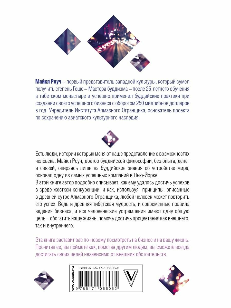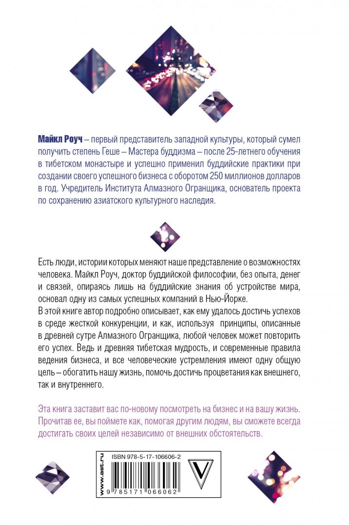 В этой книге автор подробно описывает, как ему удалось достичь успехов в среде жесткой конкуренции, и как, используя принципы, описанные в древней сутре Алмазного Огранщика, любой человек может повторить его успех. Ведь и древняя тибетская мудрость, и современные правила ведения бизнеса, и все человеческие устремления имеют одну общую цель - обогатить нашу жизнь, помочь достичь процветания как внешнего, так и внутреннего.
