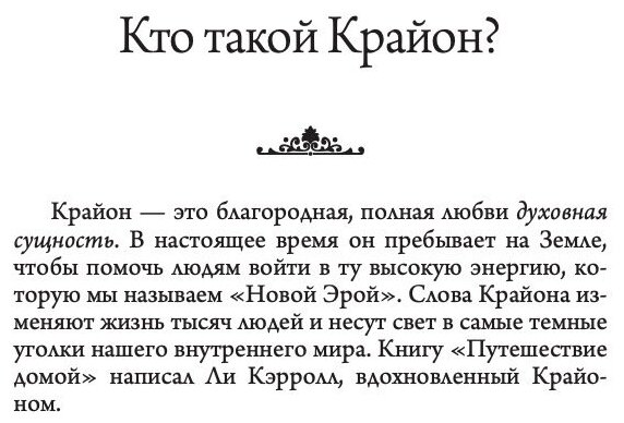 Этот роман-притчу написали в соавторстве вполне материальный человек Ли Кэрролл и бестелесный дух по имени Крайон. Главный герой "Путешествия домой" Майкл Томас очень молод, но уже успел разочароваться в жизни. В состоянии клинической смерти он оказывается в магической стране, населенной семью разноцветными ангелами и одним жутким монстром. Время от времени сюда попадают люди, желающие, как и Майкл, понять, "как все устроено в этом мире", и обрести духовную опору. Их ожидают непростые испытания, но и ставка в игре высока...