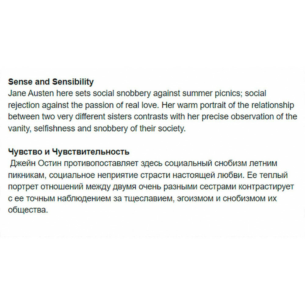 Тем, кто знаком с творчеством Джейн Остин, эту книгу представлять не придется. Самое первое напечатанное ее произведение, сразу ставшее известным и вошедшее в классику мировой литературы. Роман был переведен на многие языки и неоднократно экранизирован. Если же Вы не читали и не смотрели фильм по книге, то представьте себе классическое произведение, написанное женщиной-автором. Неторопливое повествование, живописные описания природы и действующих героев, рассуждения («разум») чередуются с эмоциональными событиями («чувства»). В книге есть трогательные черно-белые иллюстрации, аутентичные старинным изданиям, каждая снабжена подписью. Книга недорогая, поэтому бумага газетная, но не самая плохая, шрифт некрупный, но вполне читабельный.