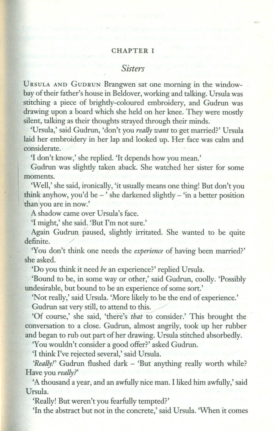 .Women in Love is, however, a profound response to a whole cultural crisis. The "progress" of the modern industrialized world had led to the carnage of the First World War. What, then, did it mean to call ourselves "human"? On what grounds could we place ourselves above and beyond the animal world? What are the definitive forms of our relationships - love, marriage, family, friendship - really worth? And how might they be otherwise?