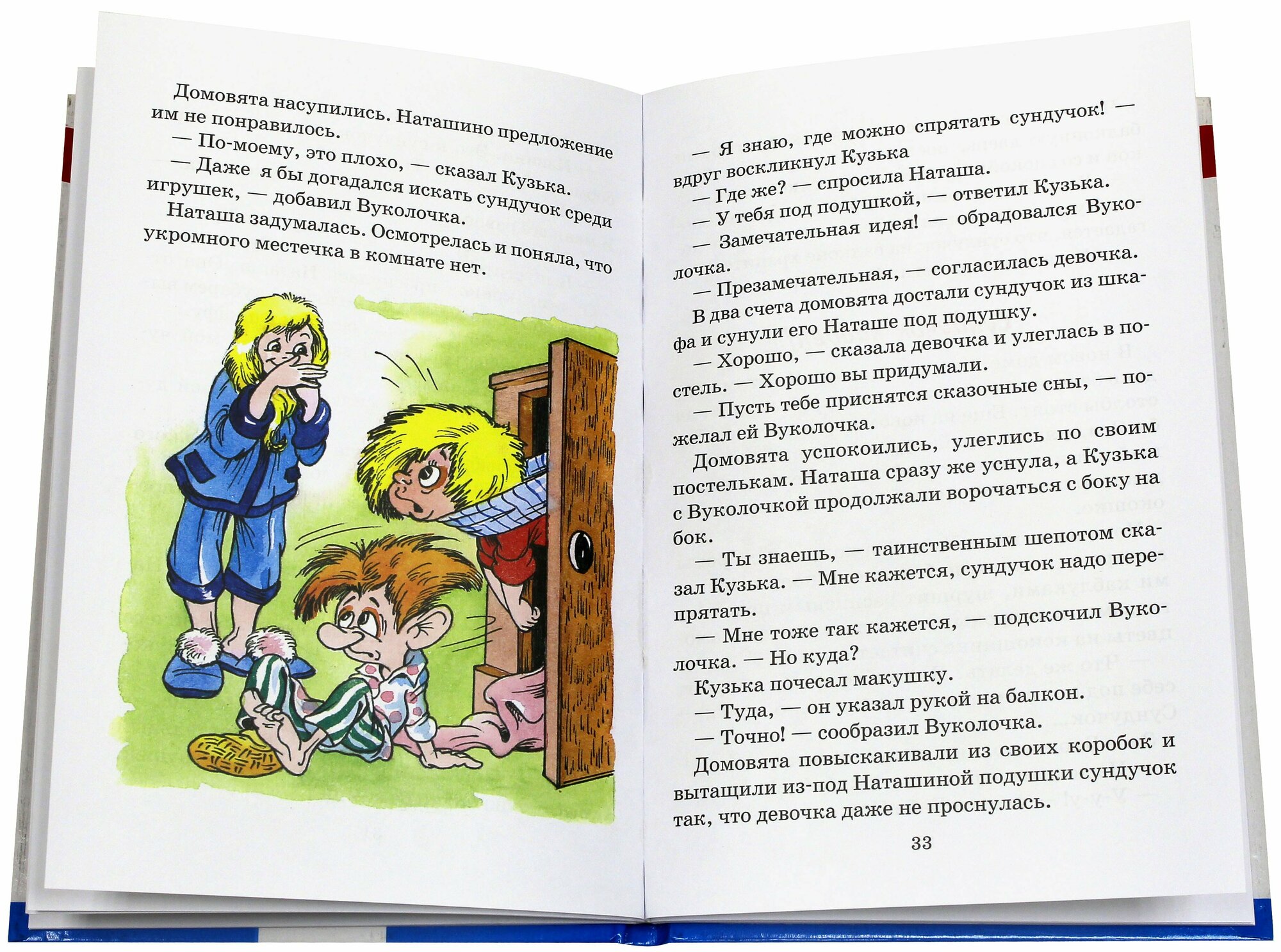 Книга формата А-5, обложка – твердая, 94 страницы, шрифт – крупный, листы – белые. Всеми полюбившиеся приключения домовенка Кузьки, которого хочет похитить Баба Яга и на что только она не идет, чтобы заполучить своё «счастье»…