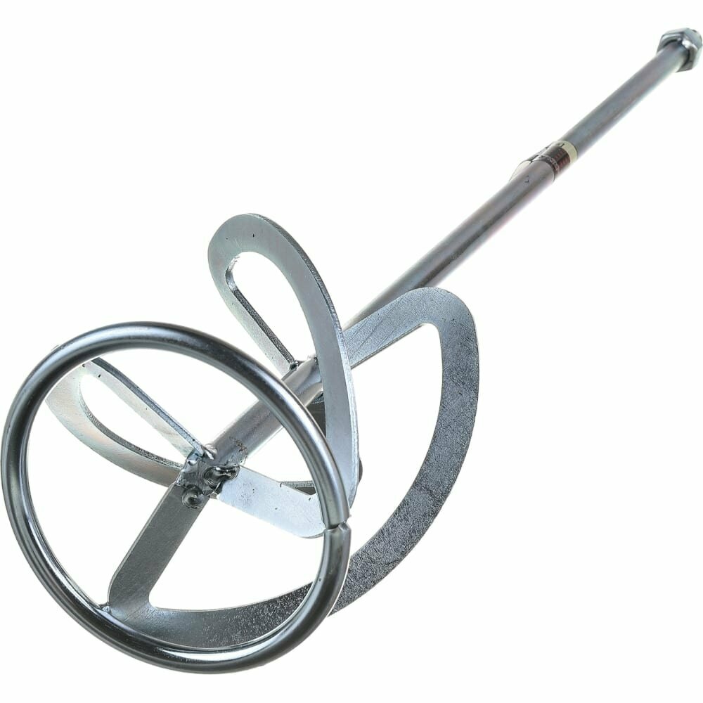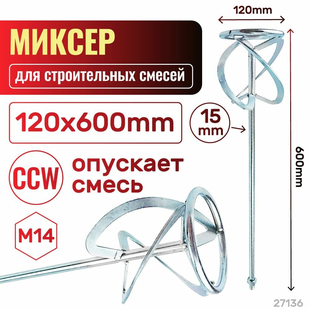 Стержень и лопасти, установленные в нижней части миксера, изготовлены из оцинкованной углеродистой стали. Хвостовик стержня имеет резьбу М14. Длина изделия 600мм, диаметр 120мм.Насадка применяется с электродрелью-миксером для перемешивания всевозможных штукатурных и клеевых составов, гипса, шпаклевок, песчано-гравийных смесей и других строительных растворов и смесей. Благодаря удобной конструкции насадки при перемешивании нижний слой состава легко перемещается наверх, благодаря чему состав смеси равномерно и легко перемешивается.
