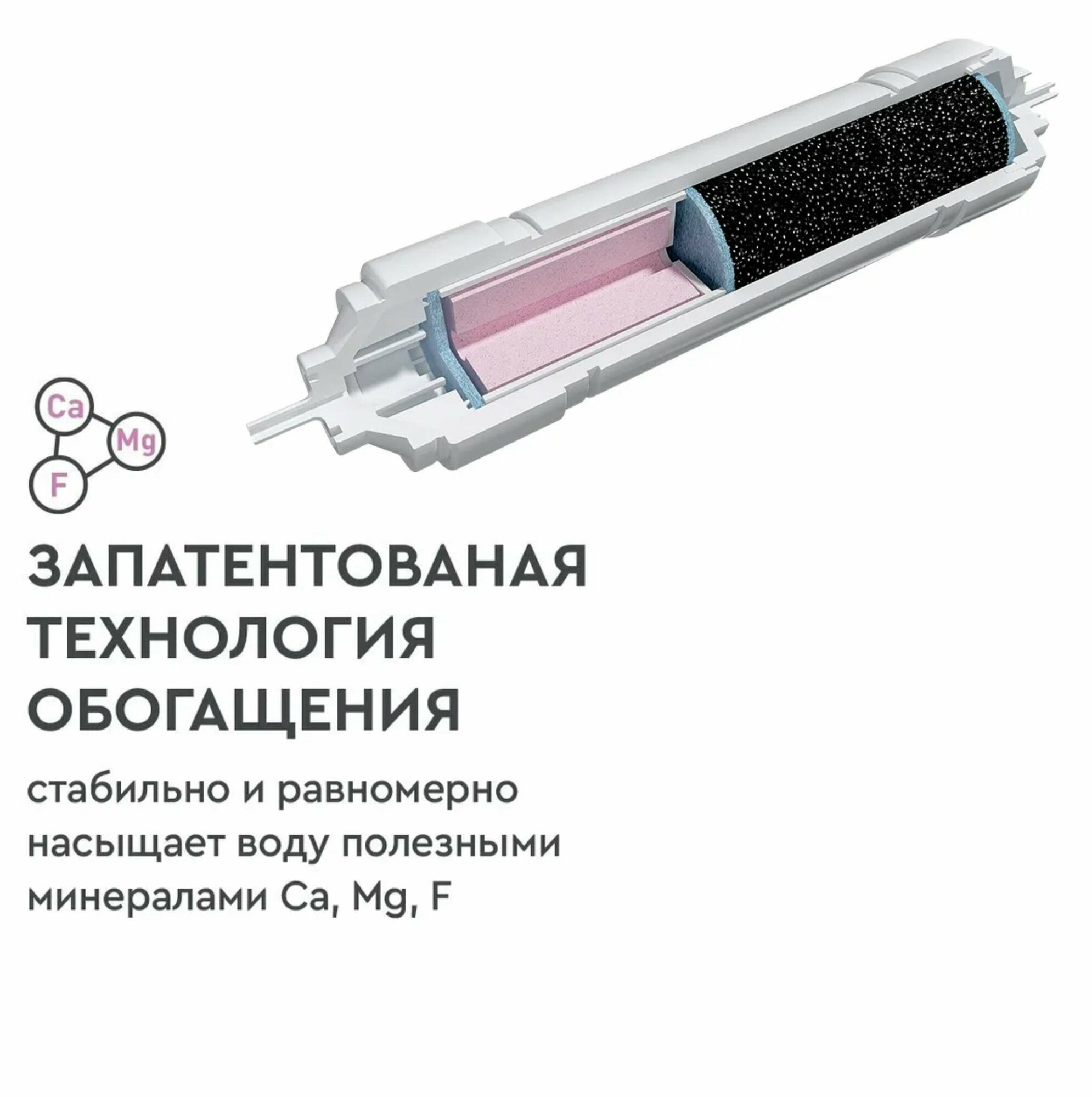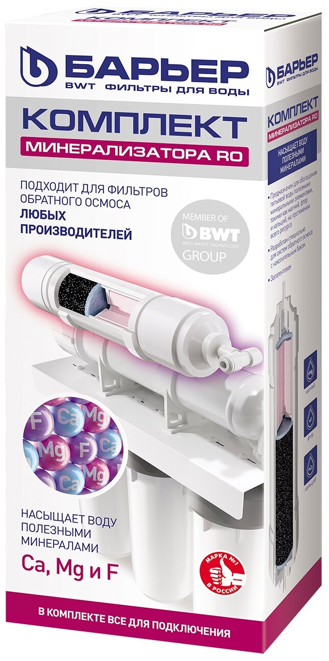 Комплект фитингов + минерализатор для модернизации системы обратного осмоса в осмос с минерализатором. т.е. данный комплект позволяет сделать ваш стандартный фильтр осмос осмосом с минерализатором. Предназначен для установки в 5-ю ступень обратноосмотической водоочистной системы БАРЬЕР Профи Осмо М. Картридж возвращает воде физиологическую полноценность, насыщает её полезными минеральными компонентами – кальцием, магнием и фтором. Ресурс 1000 литров.