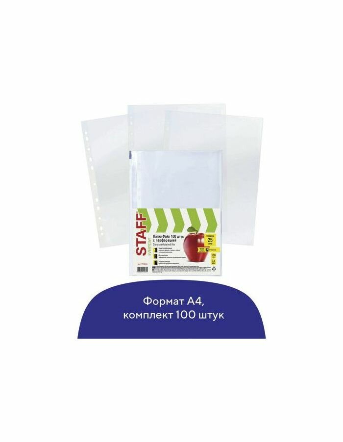 Перфорированные папки-файлы STAFF — оптимальное решение для различных государственных учреждений, офисов коммерческих предприятий. Предназначены для хранения и защиты печатных документов.Перфопапки формата А4 с вертикальным размещением содержат универсальную перфорацию, а также имеют гладкую поверхность и прочные швы. Толщина пленки - 25 мкм, что подходит для хранения до 20 листов в 1 папке-файле.Данный товар относится к эконом-сегменту.Благодаря комплекту из 100 штук проблема нехватки файлов в офисе или дома будет устранена. Покупайте товары для офиса STAFF по доступной цене в нашем интернет-магазине!