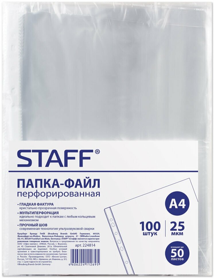 | Прочие особенности и свойства | Бюджетная папка-файл перфорированная STAFF подходит для подшивки документов в папки с любым кольцевым механизмом и скоросшивателем. Ориентация:вертикальная Количество в комплекте:100 шт. Фактура |