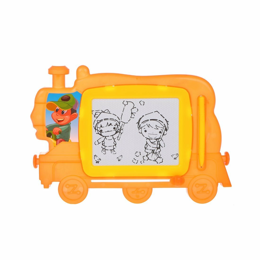 Доска для рисования "Паровоз", выполненная в виде стилизованного локомотива с веселым машинистом, окрашена в желтый цвет. Рисовать на ней легко благодаря наличию специальной ручки, а подвижный бегунок быстро сотрет неудавшуюся картинку, очистив место для следующего шедевра.
