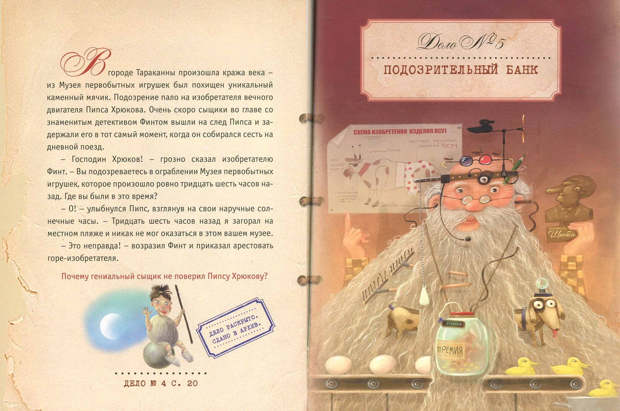 Качество книги отличное, издание небольшое, но подарочное. Рисунки красивые и смешные. Сам текст представляет собой детективные головоломки с юмором (преступления, которые распутывает сыщик Финт, приехавший с сказочную страну). Ответы в конце книги. Кстати, погуглила - художник - лауреат различных международных премий в области карикатуры. -