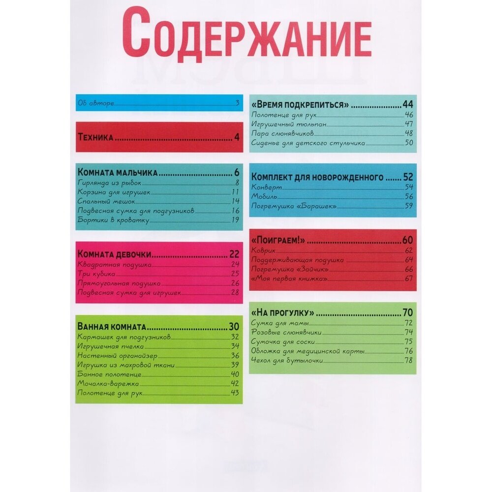 Стильные вещицы для самых маленьких членов семьи!В этой книге будущих мамочек, а также бабушек, тетушек и просто любительниц рукоделия ждет превосходная коллекция вещиц для новорожденных - на все случаи жизни! Если вы хоть раз держали в руках нитку и иголку, то сшить любое изделие из представленных в книге, следуя подробным пошаговым инструкциям, не составит для вас никакого труда. Удобные аксессуары и украшения для детской кроватки и пеленального столика, игрушки, бортики, мобили, чехлы для бутылочек и подгузников и даже первая "мягкая" книжка - все эти милые вещицы вы сможете выполнить самостоятельно по описаниям и полноразмерным выкройкам. "Приданое" вашего малыша будет выполнено в едином стиле и порадует даже самых взыскательных мам! + 1 вкладка 560х800 мм.