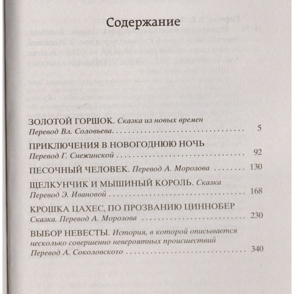 В сборник произведений знаменитого немецкого прозаика Эрнста Теодора Амадея Гофмана вошли его самые известные сказки («Золотой горшок», «Щелкунчик и мышиный король», «Крошка Цахес, по прозванию Циннобер») и новеллы («Приключения в Новогоднюю ночь», «Песочный человек», «Выбор невесты»), которые стали своего рода визитными карточками писателя и со временем были признаны шедеврами европейской романтической прозы. За прихотливой чередой странных, диковинных персонажей, за столкновениями страстей, за невероятными превратностями судеб незримо, а порой и явно присутствует Автор – оригинальный мифолог-мистик, певец «стихийных духов» и творец «совмещенных реальностей», под пером которого Дрезден XIX столетия может обернуться утопической Атлантидой, а украшенная к Рождеству детская комната – дивной волшебной страной; художник-визионер, одержимый кошмарными наваждениями, странными иллюзиями, зловещими подменами и головокружительными фантасмагориями; язвительный сатирик, зорко подмечающий социальные и нравственные изъяны своей эпохи; лукавый пародист-пересмешник, артистично и самозабвенно «играющий в литературу» и создающий виртуозные отражения Жизни и Искусства.