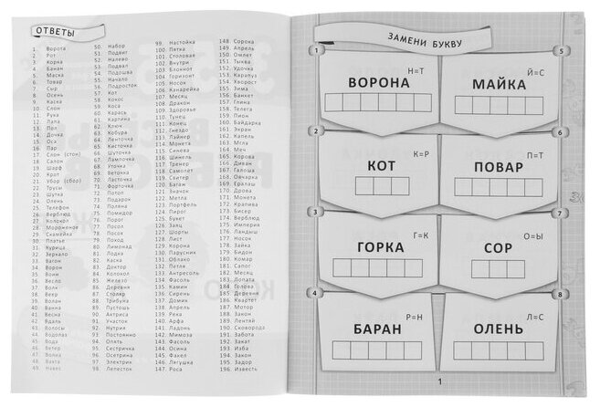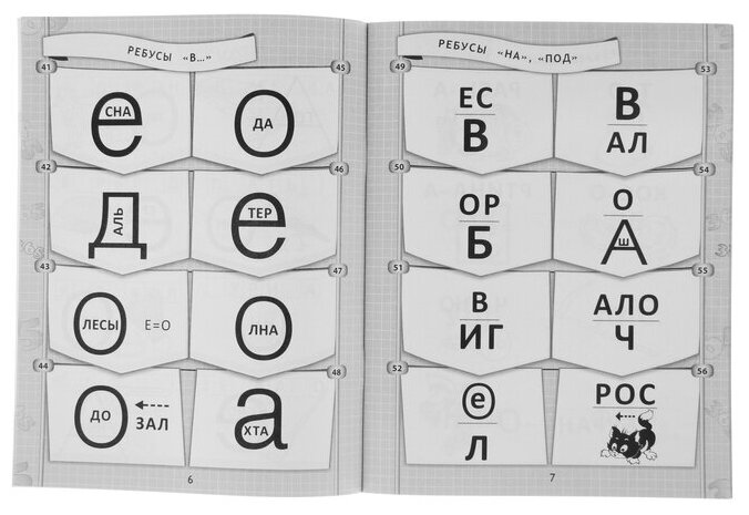 Книга с ребусами разного варианта. Напечатаны на черно белой добротной бумаге. Отгадываем с сыном 5,5 лет с интересом. Но некоторые ребусы вызывают сложности. Для детей 6-7 лет скорее рассчитана книга. У меня, как взрослого человека, не имеющего музыкального образования, вызвали трудности решения ребусов с нотами. Ответы имеются на обратной стороне обложки в начале и конце.