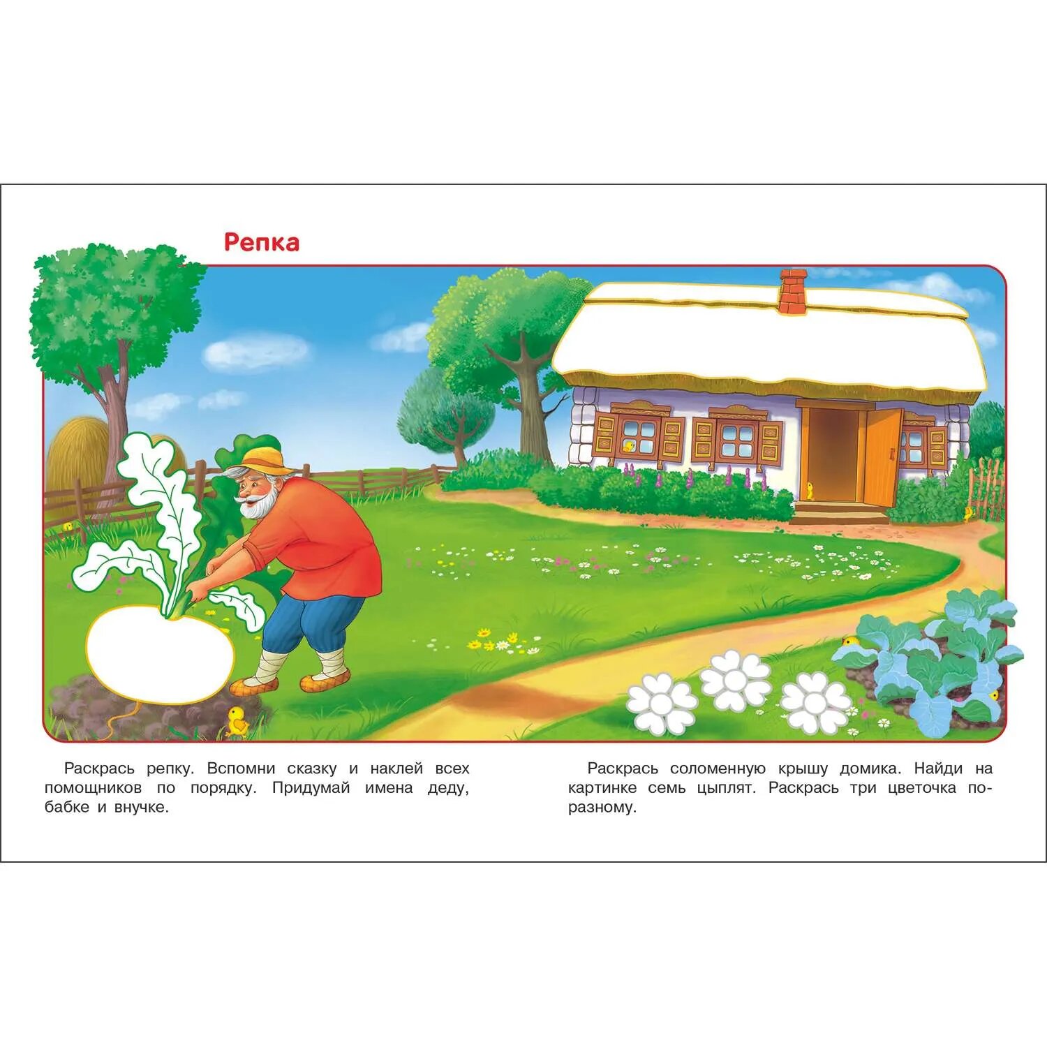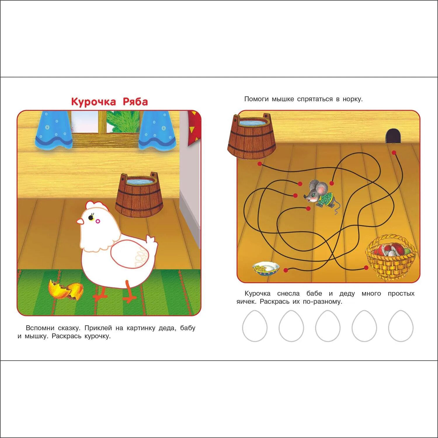Неплохая книжка для занятий с ребёнком по мотивам русских сказок: Теремок, Курочка Ряба, Репка, Три медведя, Козлятки и волк. Один разворот - одна сказка, в центре -лист с наклейками для заданий, наклейки хорошего качества. Помимо заданий на наклеивание есть задания типа раскрасить, найти отличия и т.п.