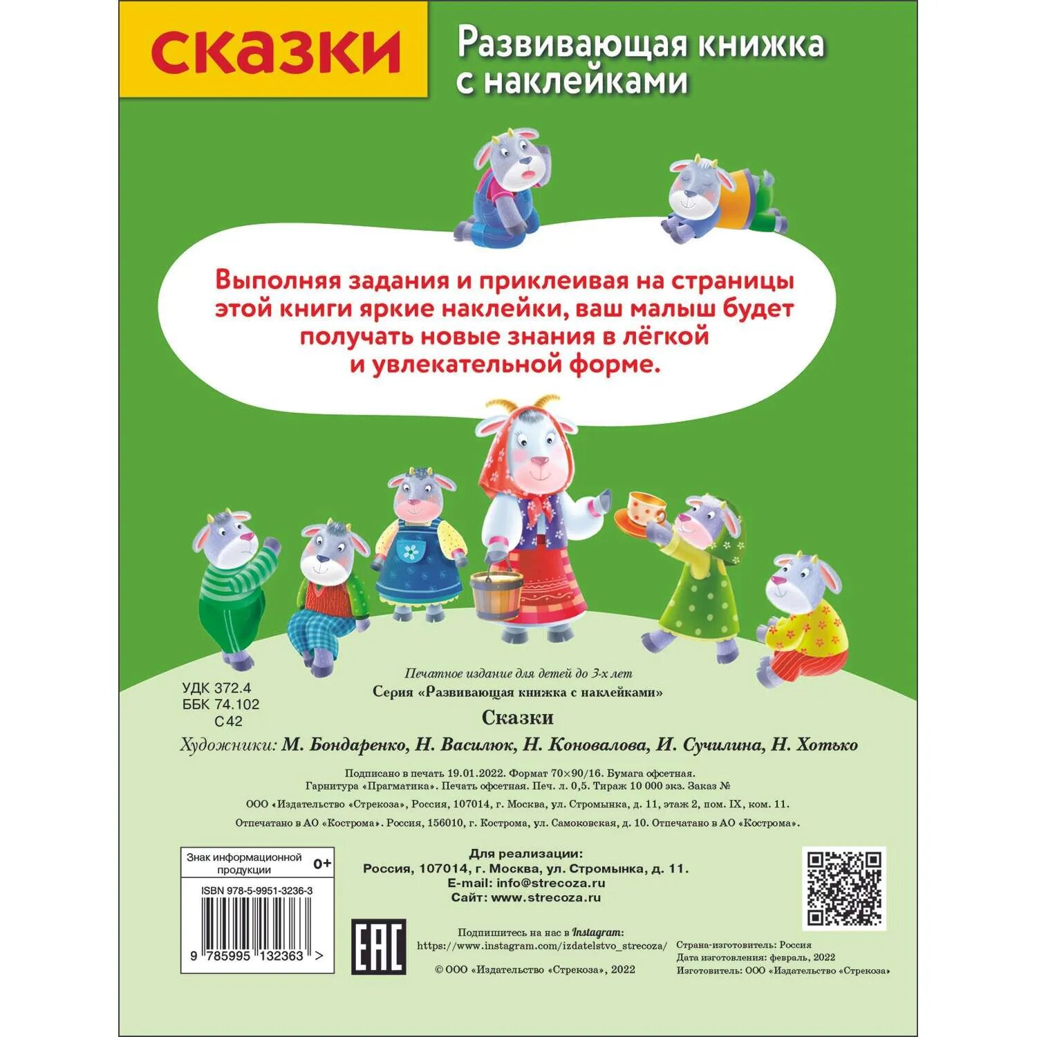 Сказки. Развивающая книжка с наклейками (Бондаренко М.; Василюк Н.; Коновалова Н.); Стрекоза Торговый дом ООО, 2017
