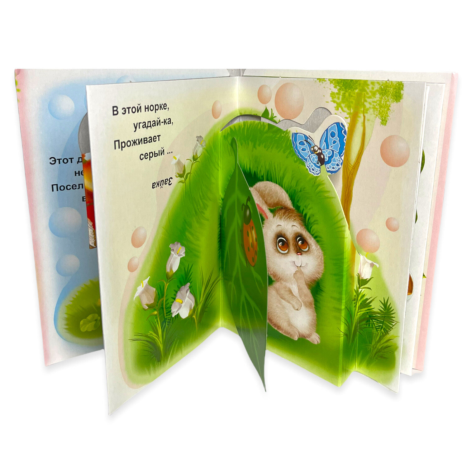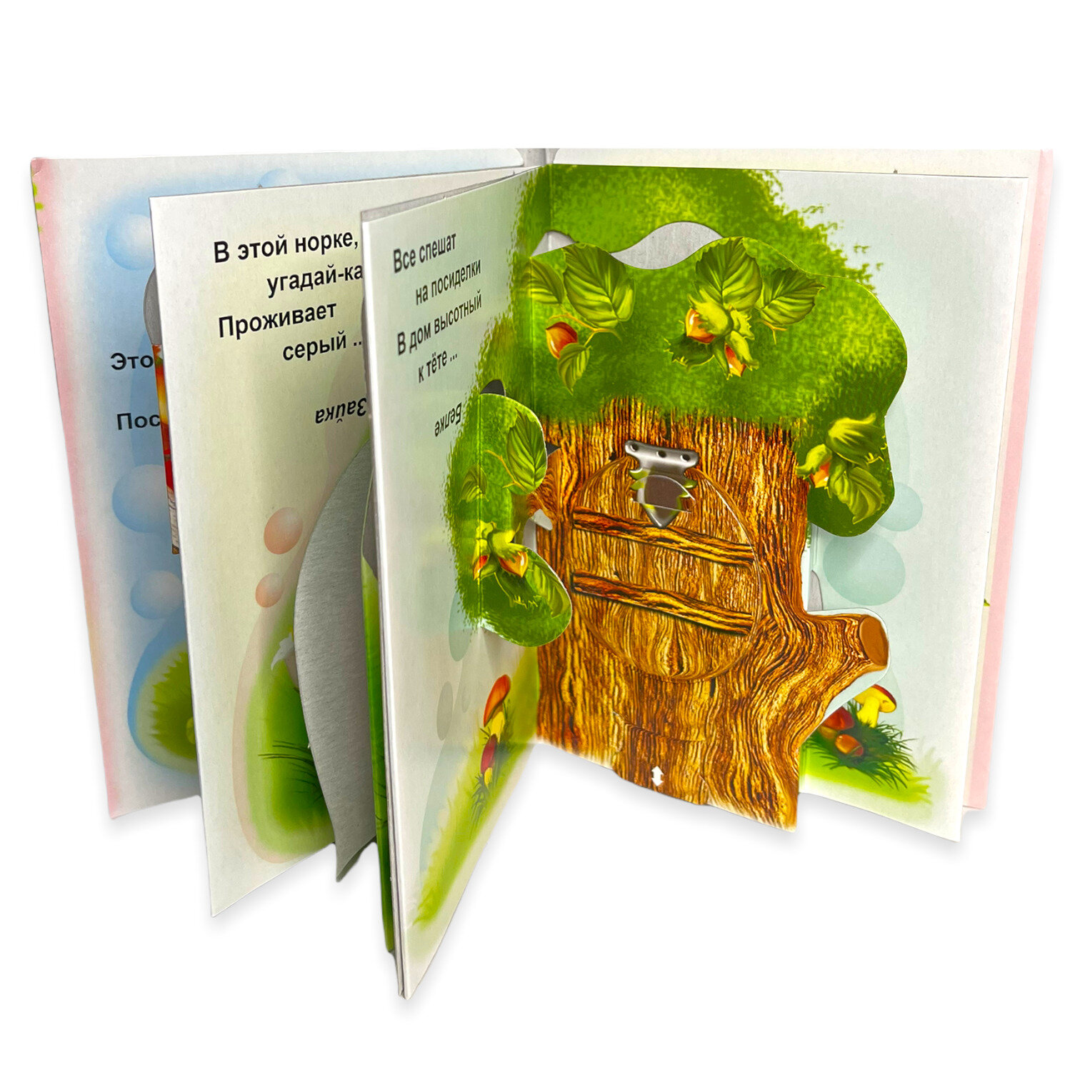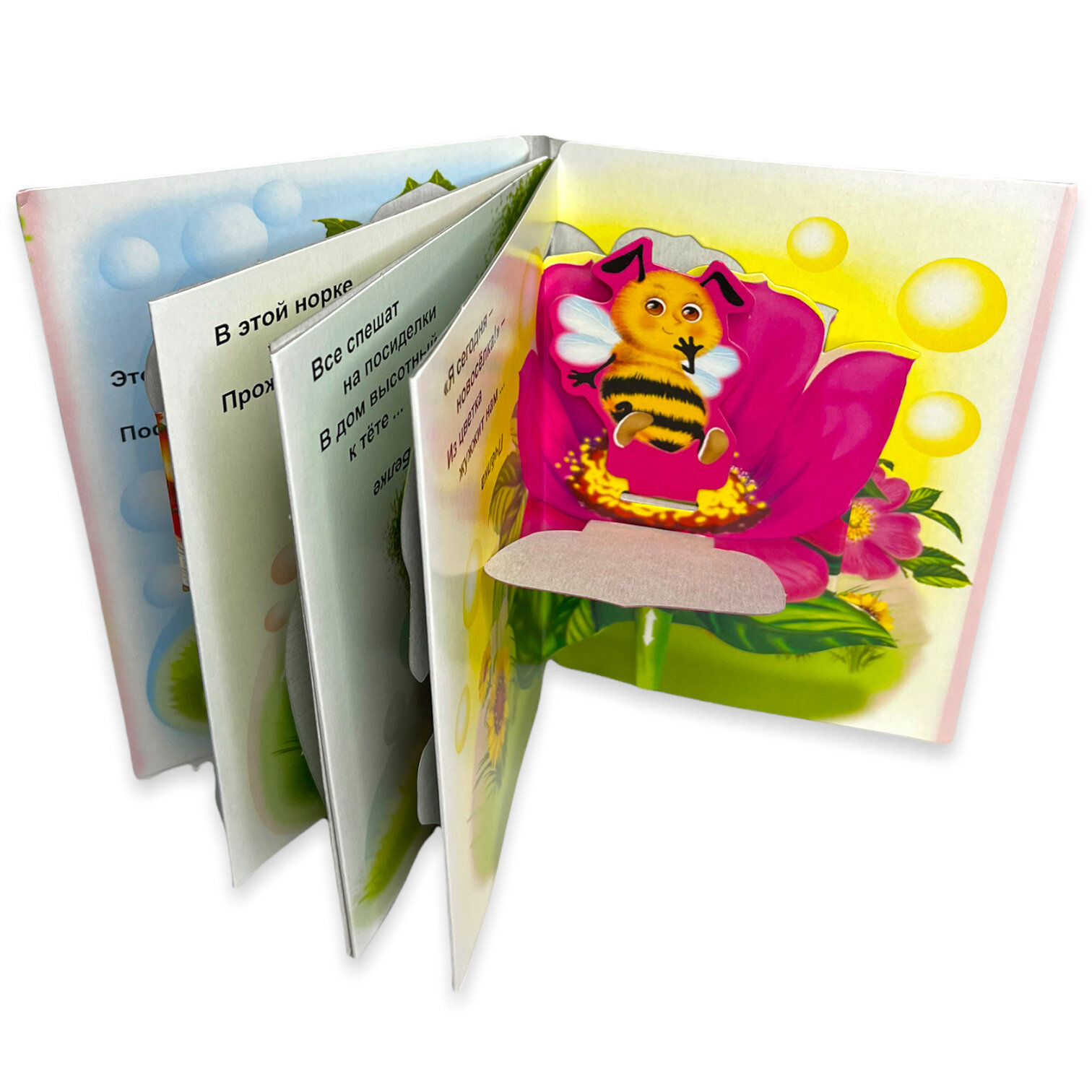 В книжке 4 странички- собачка, зайка, белочка и пчелка. По отзывам на книжку сразу подклеила все подвижные части скотчем. Оттого и прожила книжка больше года.