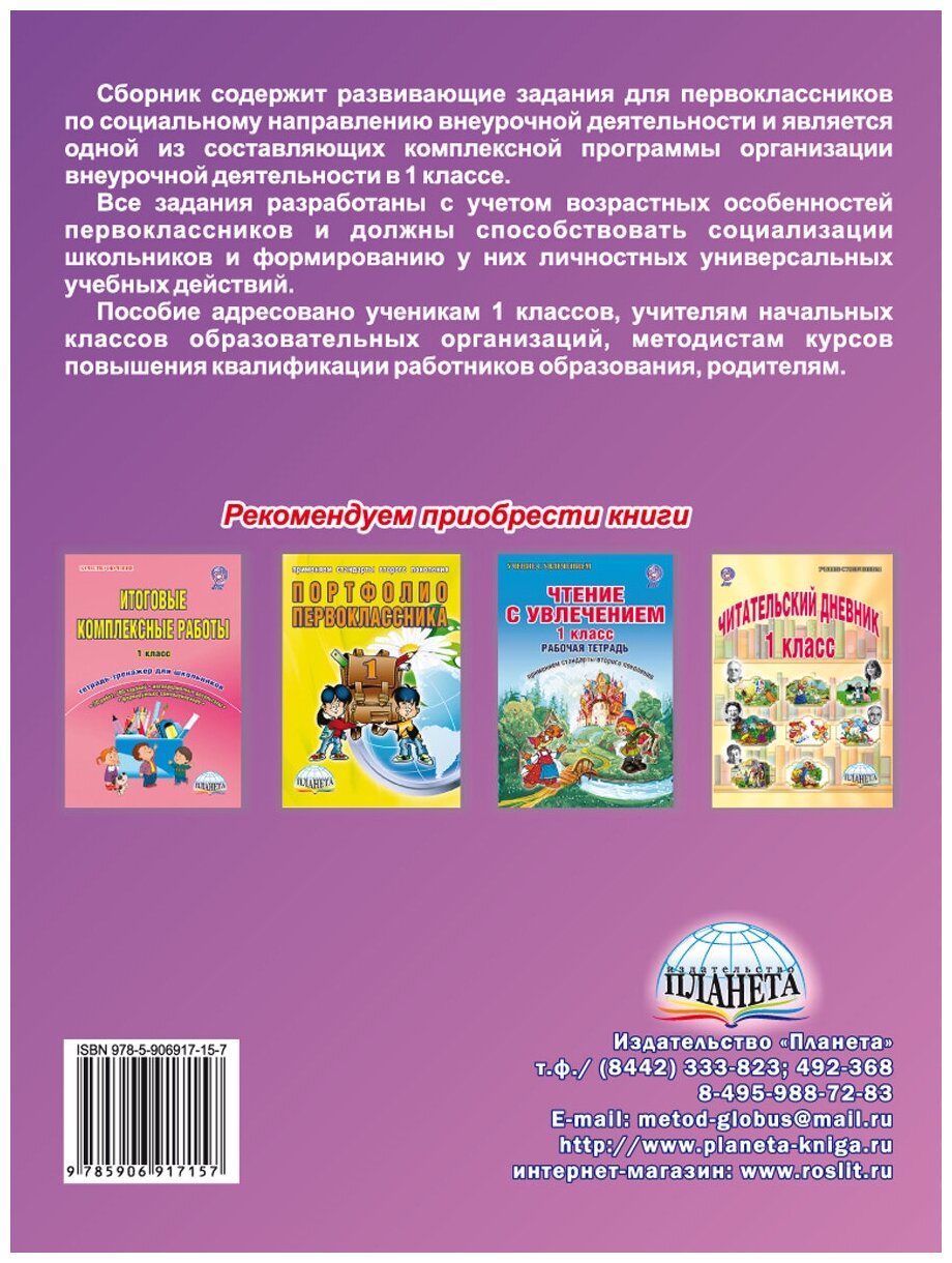 Сборник содержит развивающие задания для первоклассников по социальному направлению внеурочной деятельности и является одной из составляющих комплексной программы организации внеурочной деятельности в 1 классе.
