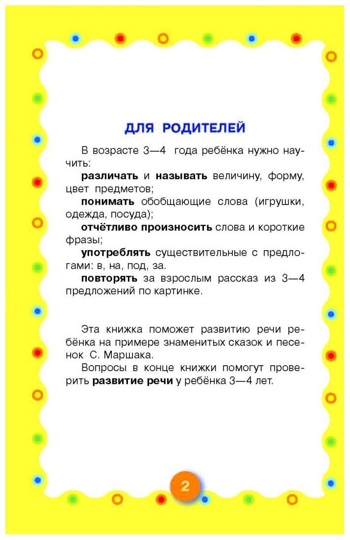 С помощью этой маленькой книжечки ребёнок 3-4 лет познакомится со знаменитыми произведениями С. Маршака - "Сказка о глупом мышонке", "Сказка об умном мышонке" и переводами весёлых чешских песенок. Сказки и песенки помогут ребёнку развить речь, память, мышление. А маленькие песенки малыши с лёгкостью запомнят наизусть. Книгу открывает методическая подсказка для родителей, а вопросы в конце помогут проверить развитие речи у ребёнка 3-4 лет.