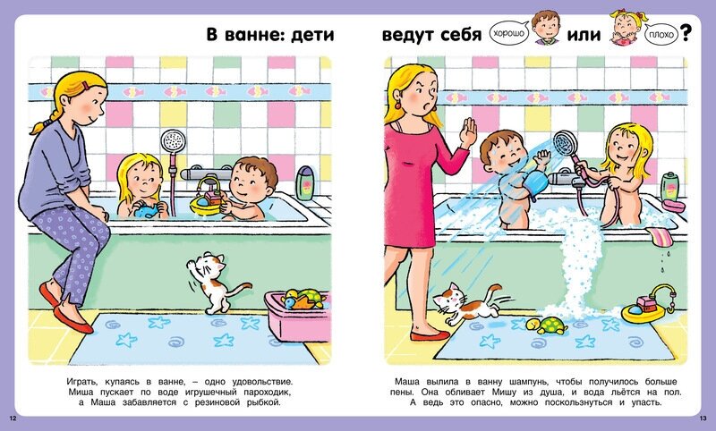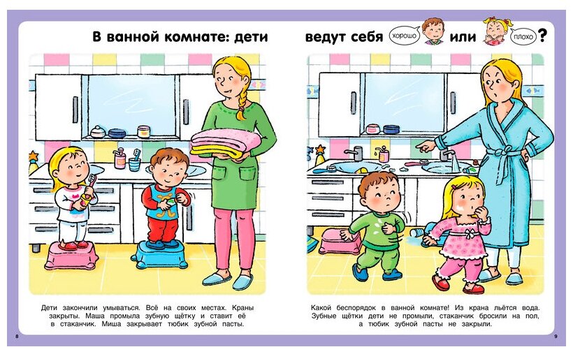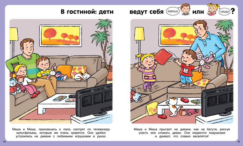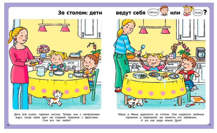 Из этой полезной книги дети узнают, как вести себя на дороге, в лесу, за столом, в магазине, на детской площадке, как принимать гостей, общаться с животными, и многое другое. Рассматривая весёлые картинки, ребенок поймет, "что такое хорошо и что такое плохо".
