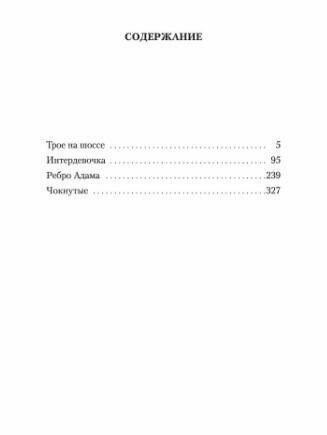 В. В. Кунин — писатель и сценарист, обладавший талантом достоверно воссоздавать дух описываемого им времени. Вниманию читателя предлагаются четыре киноповести, очень разные по настроению. Это драматичные «Трое на шоссе» и «Интердевочка», трагикомическое повествование о женщинах без мужчин «Ребро Адама» и эксцентричная история строительства железных дорог в XIX веке («Чокнутые»). Все герои Кунина — будь то водите-ли-дальнобойщики в обстоятельствах «застоя» конца 1970-х или «интердевочки» времен перестройки — живые, узнаваемые, они действуют в реалиях нашего Отечества. Именно поэтому произведения писателя были столь востребованы кинематографом и послужили литературной основой замечательных фильмов.
