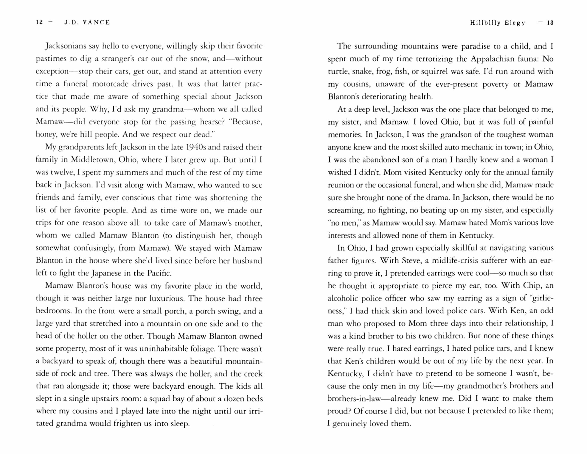 The Vance family story begins hopefully in post-war America. J. D.’s grandparents were “dirt poor and in love,” and moved north from Kentucky’s Appalachia region to Ohio in the hopes of escaping the dreadful poverty around them. They raised a middle-class family, and eventually their grandchild (the author) would graduate from Yale Law School, a conventional marker of their success in achieving generational upward mobility.