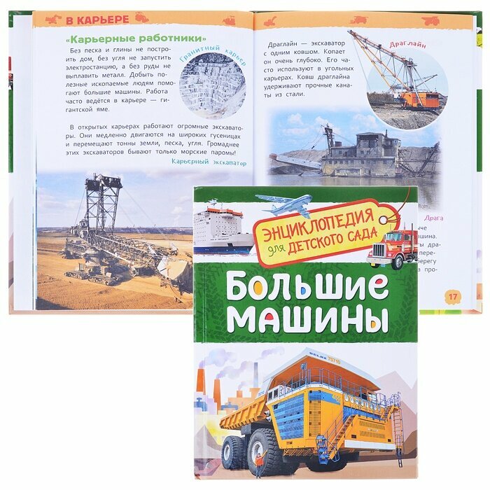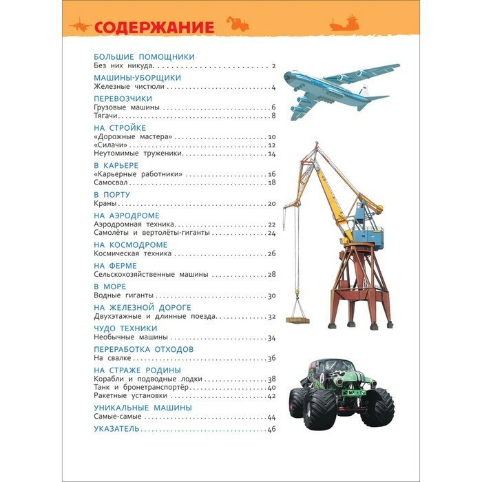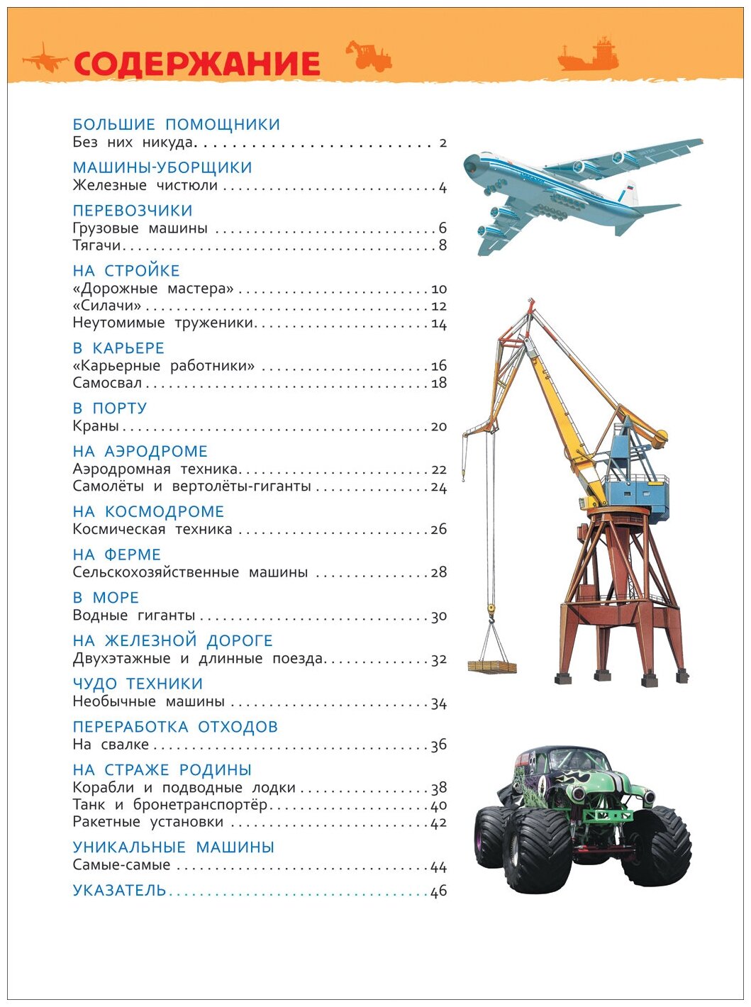 Для меня для взрослого человека- эта книга была очень познавательна и расширила мой кругозор. О многих машинах (перечисленных в книге) я даже не имела представления, и поэтому сама с большим интересом читала эту энциклопедию доче. А вы представляете как это будет интересно ребенку. К каждой представленной в книге машине есть хорошая и четкая фотография (не схематичный рисунок), с расшифровкой частей машины, которая в полной мере позволяют оценить и устройство, и габариты и функционал такой техники.