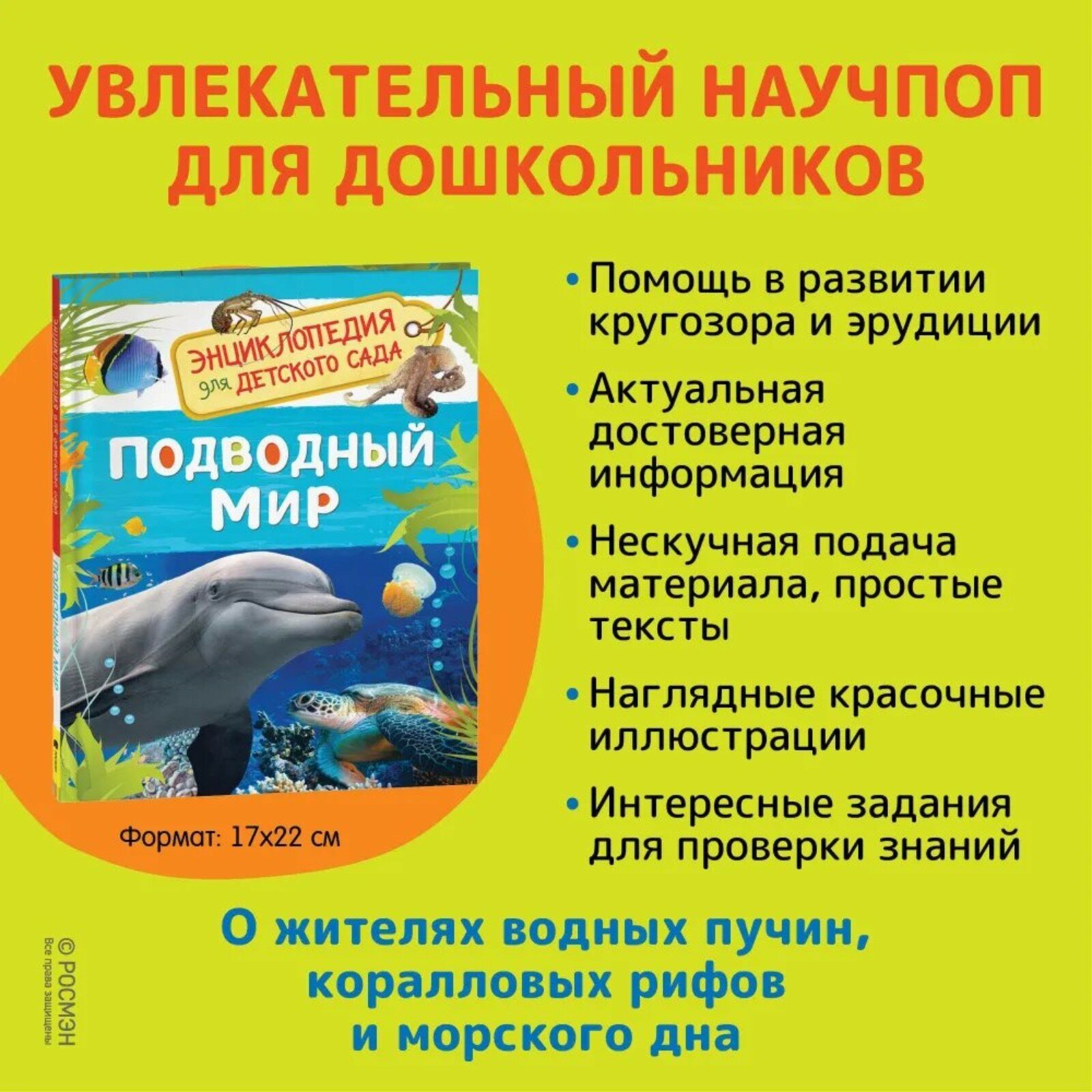 Купила энциклопедию ребёнку трёх лет. Тексты чёткие, короткие, о самом главном. Картинки яркие, крупные, есть фото морских обитателей. Одна из любих книг этой серии. Ребёнок пересматривает книгу по несколько раз. Быстро запомнил всех морских обитателей, называет их, показывая на картинки, просит прочитать информацию. Очень интересна рубрика "Знаешь ли ты". Рекомендую данную энциклопедию для расширения кругозора Вашего малыша.