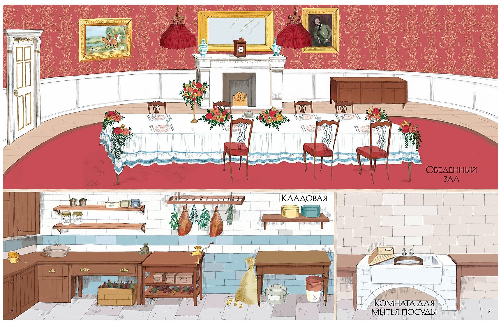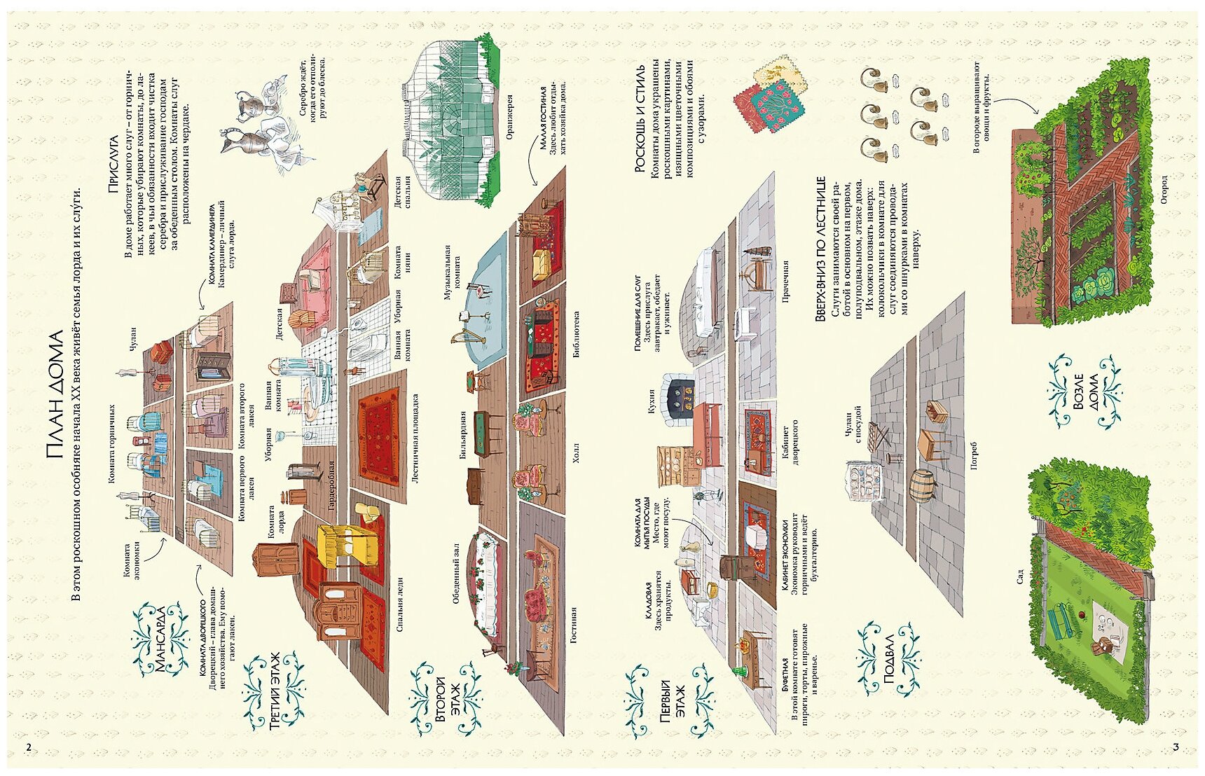 Великолепный альбом! Это усадьба английского лорда начала 20 века. Всё сделано очень качественно и с любовью - начиная с обложки, которую приятно взять в руки, и заканчивая прорисовкой фонов и самих наклеек. На каждой странице мы видим комнату или помещение дома, которые можно "обставлять" подходящей мебелью и декорировать разнообразными предметами интерьера (картины, подушки, статуэтки, цветы и так далее). В начале на развороте мы видим подробный план усадьбы с комментариями. Перечислю помещения - гостиная, малая гостиная, библиотека, прачечная, обеденный зал, кладовая, комната для мытья посуды и комната для хранения посуды (!!!), музыкальная комната, комната для слуг, для горничных, детская, спальня леди, кухня, погреб, чулан, буфетная, кабинет экономки, оранжерея, сад и огород. Всё соответствует эпохе начала 20 века.. в наклейках есть даже одежда тех времен. Людей нет. Замечательный подарок как маленьким, так и большим девочкам, оценят все)).