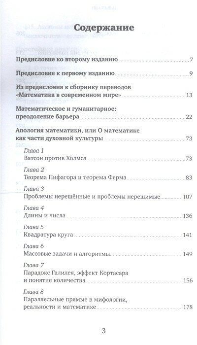 Не успев раскрыть книгу, проходим тест: технарь (тянется рука к толковому словарю - что это непонятное слово значит?), гуманитарий (скажет, при чем тут оно, это слово?) или универсал (и то, и то, - и еще раз по прочтении почесать репу и глянуть в академическое издание - словарь Лопатина). Здесь вызывает огромное уважение язык (чувствуется, что книга написана не в наши дни) - сдержанный лаконизм, ничего лишнего - и в то же время, в каждой фразе максимум информации. Автору симпатизирует объективность любимой науки, о чем он и говорит с немалой долей юмора. Лейтмотив всей книги оговорен в предисловии: задача читателя - выцепить отсюда новые для себя моменты и новую точку зрения на привычные, которые послужат не только пищей для размышлений, но и принесут практическую пользу (замечательна аналогия пассива и актива с ручной кладью и багажом в багажном отделении). Целая глава посвящена разбору мифологических, обывательских представлений и им в противовес - научных. Еще одна из поставленных в начале целей - тренировка ума. Автор со строго математической точностью оперирует понятиями и к этому же призывает читателей в повседневной жизни. Математические понятия иллюстрируют (!) совершенно неожиданные, поразительные отсылки к классической литературе. Основной вывод здесь - то, что нет в чистом виде "физиков" и "лириков" (эпиграфом взяты строки Бориса Слуцкого), а то, что человеку доступны оба типа мышления, кому-то в большей, кому-то в меньшей степени, и задача каждого - повышать свой общий культурный уровень. И еще одна симпатичная мысль: математика не противопоставлена естественным и гуманитарным наукам, а так же - и наука, и в определенной мере вид искусства!