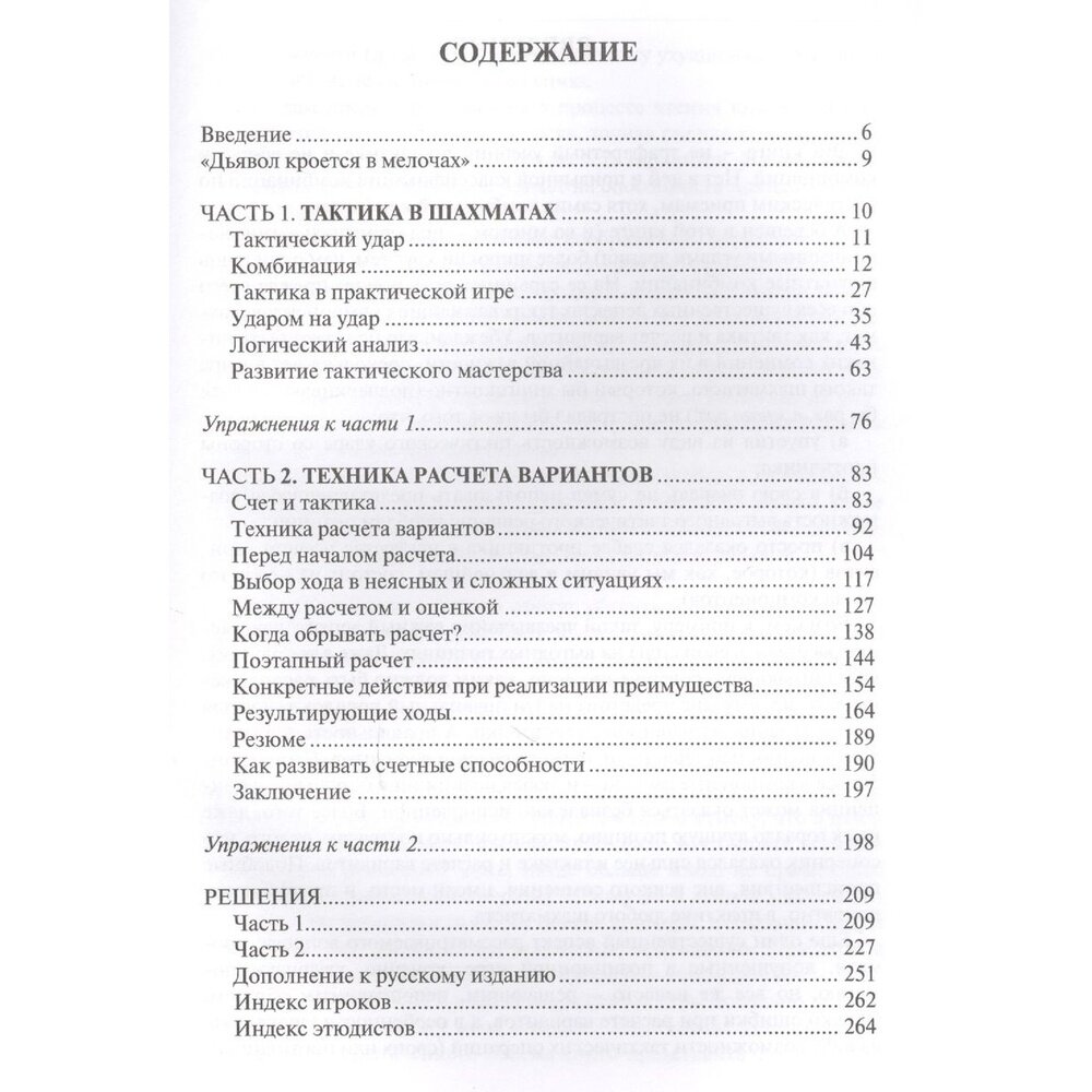 Основным занятием шахматиста при игре является счет вариантов. Более того, сидя за доской, он занят этим процессом непрерывно, независимо от того, в какой стадии находится партия. Из чего ясна чрезвычайная важность умения считать варианты и видеть тактику для любого, кому нравится двигать фигурки по клетчатой доске. Как бы ни были важны все остальные компоненты игры, именно счет и неразрывно связанная с ним тактика, в конечном итоге, решающим образом влияют на исход партии. Автор, известный гроссмейстер и тренер, предлагает полный, систематизированный и хорошо обоснованный взгляд на указанные фундаментальнейшие компоненты успешной игры. Для широкого круга любителей шахмат.