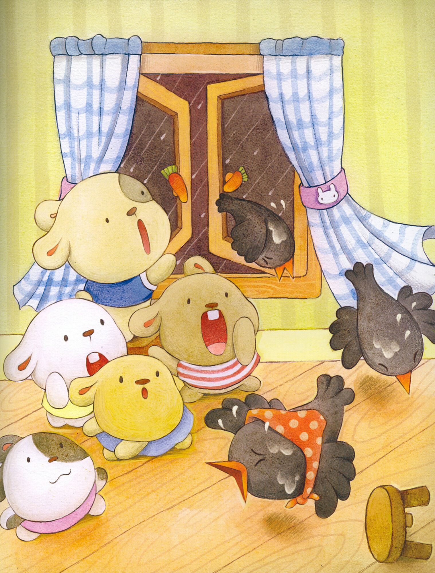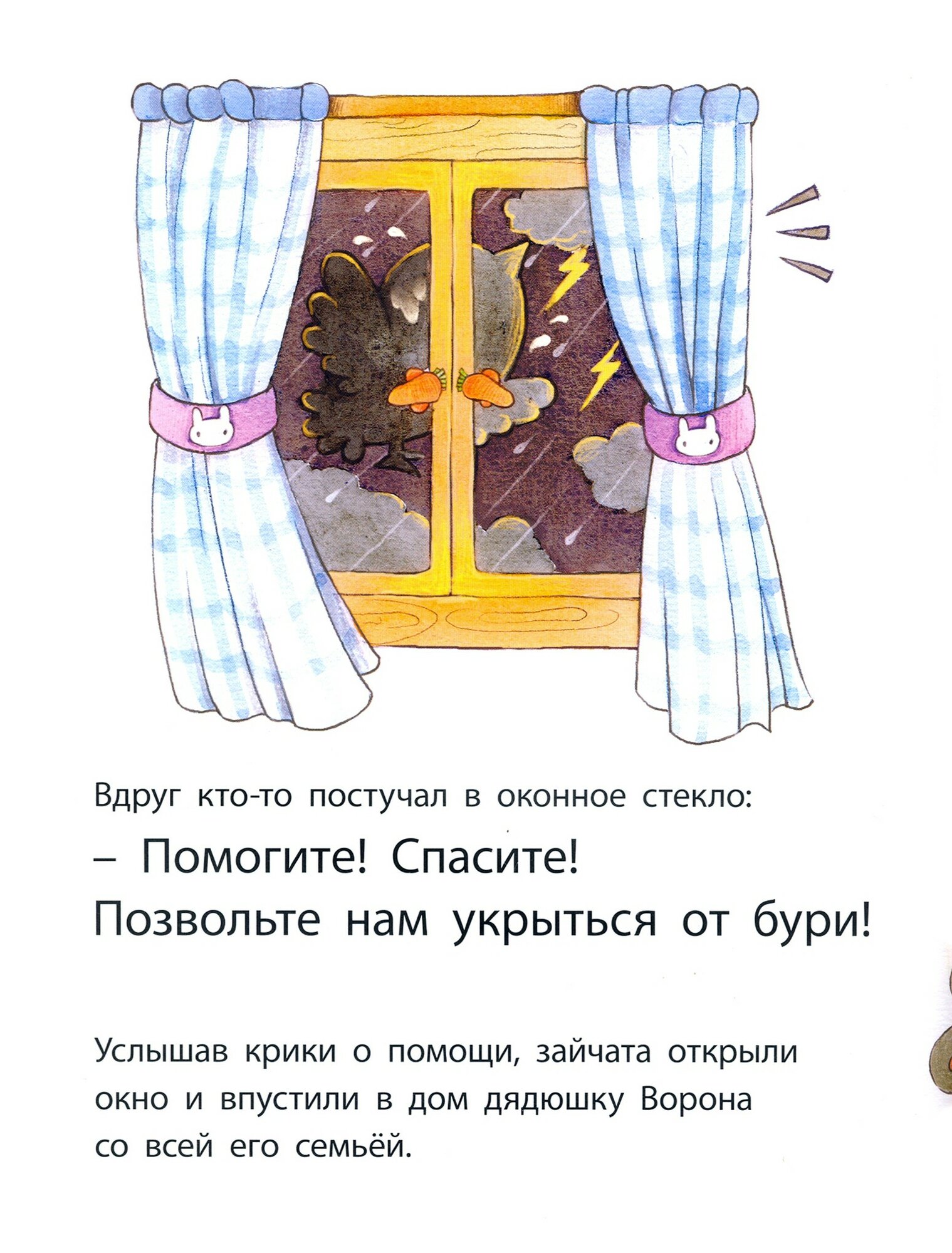 На лес обрушилась страшная буря. В дом к зайцам по очереди приходят некоторые обитатели леса, чтобы переждать бурю.