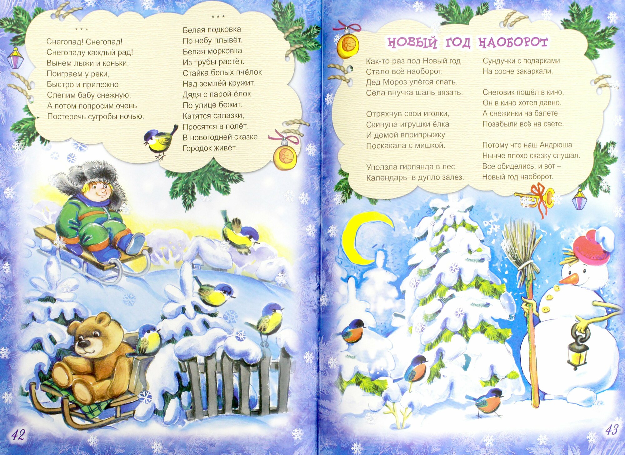 На каждом развороте текст и иллюстрации, стихи в основном все длинные, складные, рифма хорошая, сюжеты обычные, новогодние.