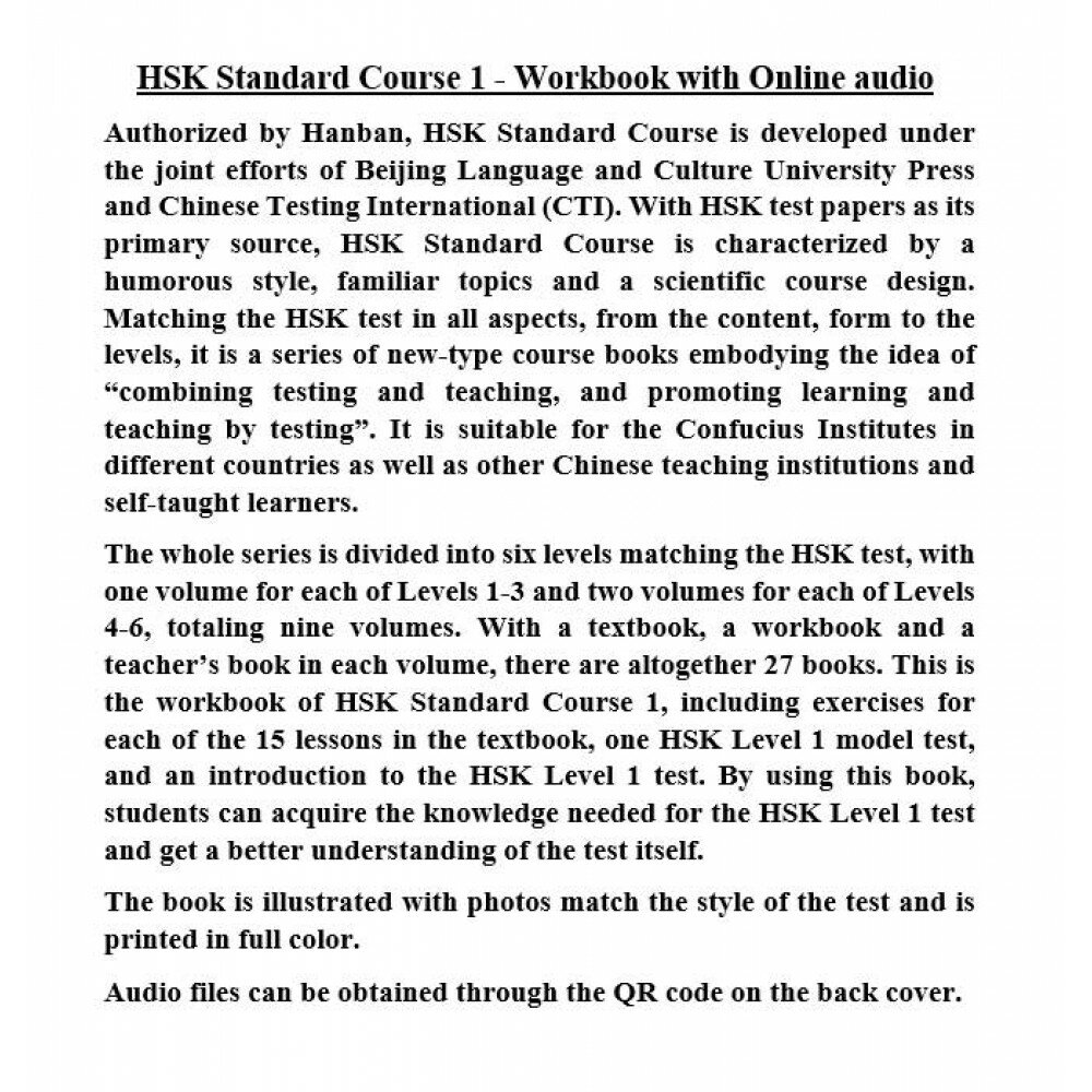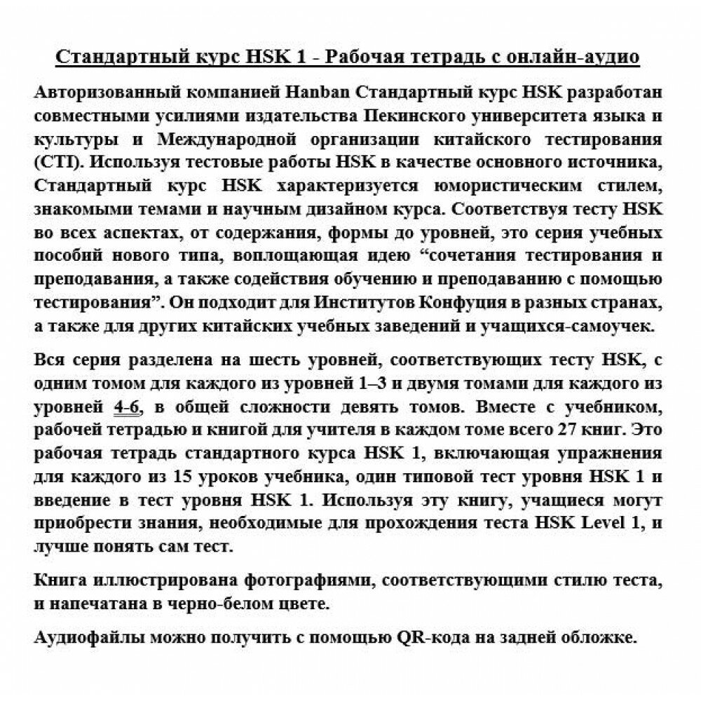 Современный курс подготовки к новому экзамену HSK, который был разработан ведущими образовательными структурами Китая. В основе курса – эффективная методика обучения в форме тестирования. Множество интересных топиков, легкий, юмористический стиль изложения материала, цветные фотографии, разнообразные аудиофайлы обеспечат быструю подготовку к экзамену по китайскому языку любого уровня сложности.