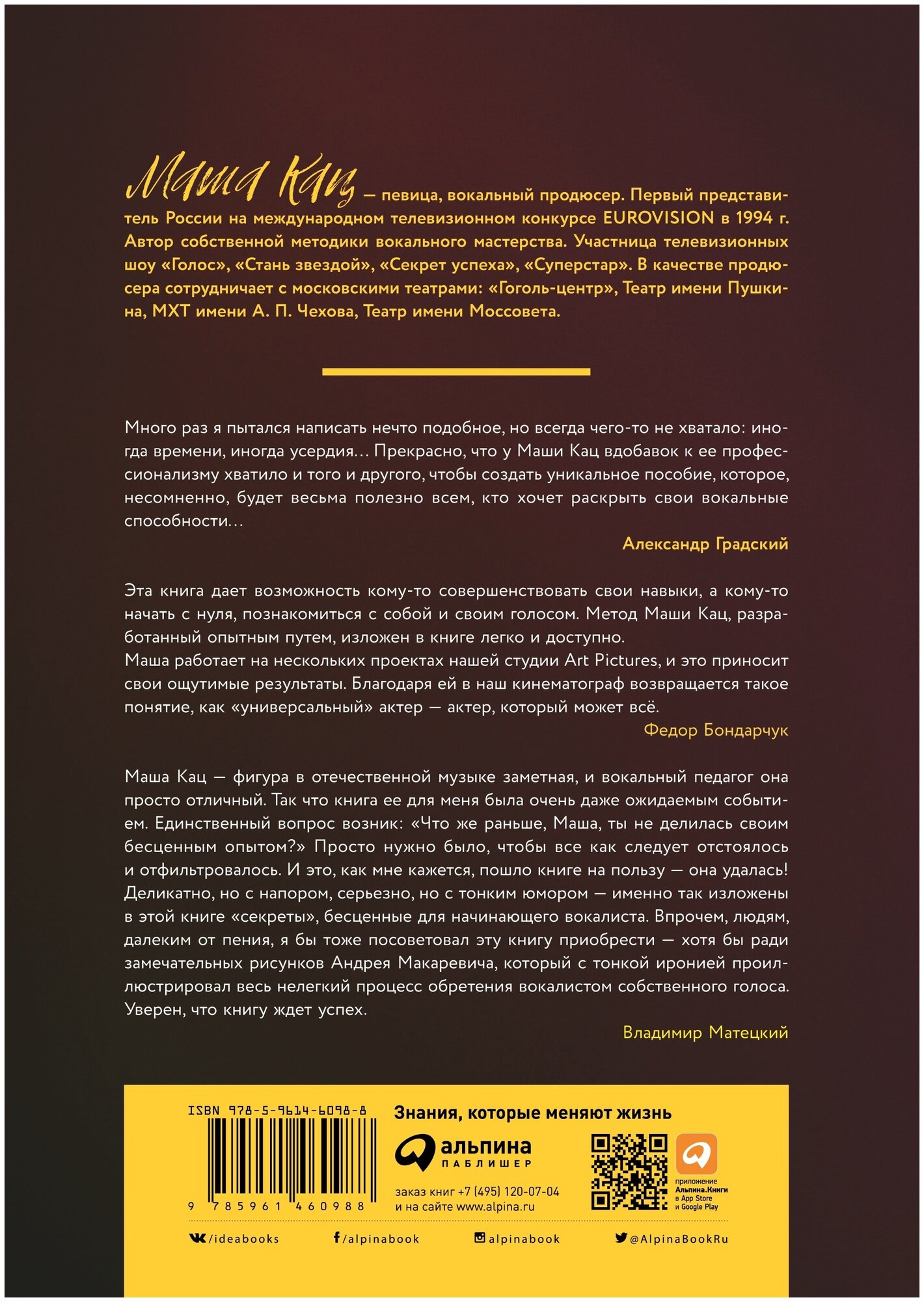 Перед вами замечательный нескучный учебник по вокалу для всех, кто любит петь, но не уверен, что у него это отлично получается. Автор книги — известная российская певица и опытный педагог Маша Кац. Ее книга поможет вам раскрыть ваш природный вокальный дар, научиться петь не только правильно, но и красиво. Текст дополнен авторскими видеоуроками. Они помогут вам без ошибок выполнить упражнения для постановки и развития голоса, обрести уверенное звучание и показать вашу яркую индивидуальность. Ироничные иллюстрации Андрея Макаревича помогут лучше запомнить самое важное. Книга адресована начинающим заниматься вокалом и профессиональным певцам, желающим усовершенствовать свое мастерство.Книга «Ваш голос» поможет развить ваши вокальные способности. Неважно, есть ли у вас музыкальное образование и сколько вам лет, — следуя советам автора, опытного и мудрого практикующего педагога с отличным чувством юмора, вы совершенно точно сможете улучшить свои певческие навыки. Вы научитесь правильно дышать, узнаете правила звукоизвлечения, разовьете музыкальный слух, сделаете звучание вашего голоса красивым и внятным, избежите распространенных ошибок, допускаемых вокалистами. Упражнения, необходимые для постановки и развития голоса, сопровождаются доступными по ссылке бесплатными видеоуроками, где показано, как правильно делать всё, о чем рассказывает автор. У вас будет возможность попрактиковаться и выполнить эти важные упражнения правильно — автор обратит ваше внимание на каждый сложный момент. В книге вы найдете множество важных подсказок, дельных советов и несложных лайфхаков, благодаря которым будете заниматься без страха, эффективно и с большим удовольствием. Вот увидите: прогресс в обучении не заставит долго себя ждать!