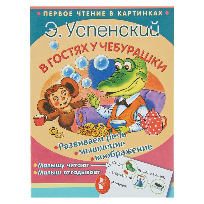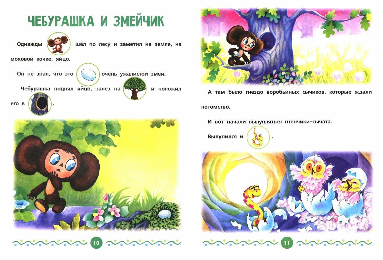 Прочитайте малышу сказки "В гостях у Чебурашки" и "Чебурашка и Змейчик" и попросите его назвать вслух те слова, которые заменены картинками. Детки с удовольствием познакомятся с этими знаменитыми друзьями, рассмотрят большие картинки, а заодно увеличат свой словарный запас, смогут научиться правильно излагать свои мысли и потренируют воображение!