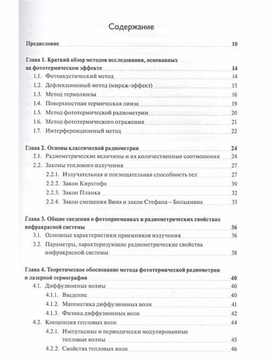 В книге содержится последовательное изложение принципов фототермической радиометрии/спектроскопии и лазерной термографии - перспективного направления в спектроскопии и тепловидении. В основе нового метода исследований лежит радиометрическая регистрация поглощенной энергии в исследуемых средах при воздействии на них лазерного излучения. Подробно излагается современное состояние и перспективы развития нового направления, его преимущества и границы применимости по сравнению с другими фототермическими методами. Рассмотрены теоретические основы метода модуляционной и импульсной фототермической радиометрии, ее различные модификации, включая резонансную и "pump-probe" фототермическую радиометрию и термографию. Приводятся многочисленные примеры практической реализации фототермической радиометрии и лазерной термографии в различных областях науки и техники, в частности для дистанционного измерения температуры объектов, исследования слабопоглощающих сред, дистанционного обнаружения и идентификации следовых количеств вещества, неразрушающего контроля материалов и покрытий, измерения их теплофизических параметров. Обсуждаются вопросы, связанные с особенностями применения метода для контроля качества полупроводниковых материалов, например, в части обнаружения подповерхностных дефектов и примесей, измерения их концентрации и энергии активации. Особое внимание в книге уделяется возможностям метода применительно к таким практически значимым областям, как медицина и биология.